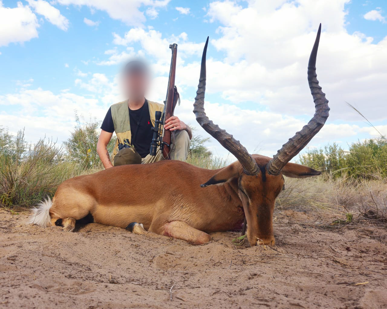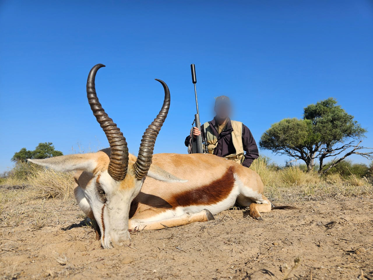 Kalahari Hunt Report = Our most recent European Family & Friends had an enjoyable and successful hunt. The daily tracking & stalking on foot was often rewarded with some fine Specimen that are now in the salt room. The evenings around the campfire was where each day’s hunting adventures were shared by the group, and relived by everyone involved. Thanks and congratulations to you all!