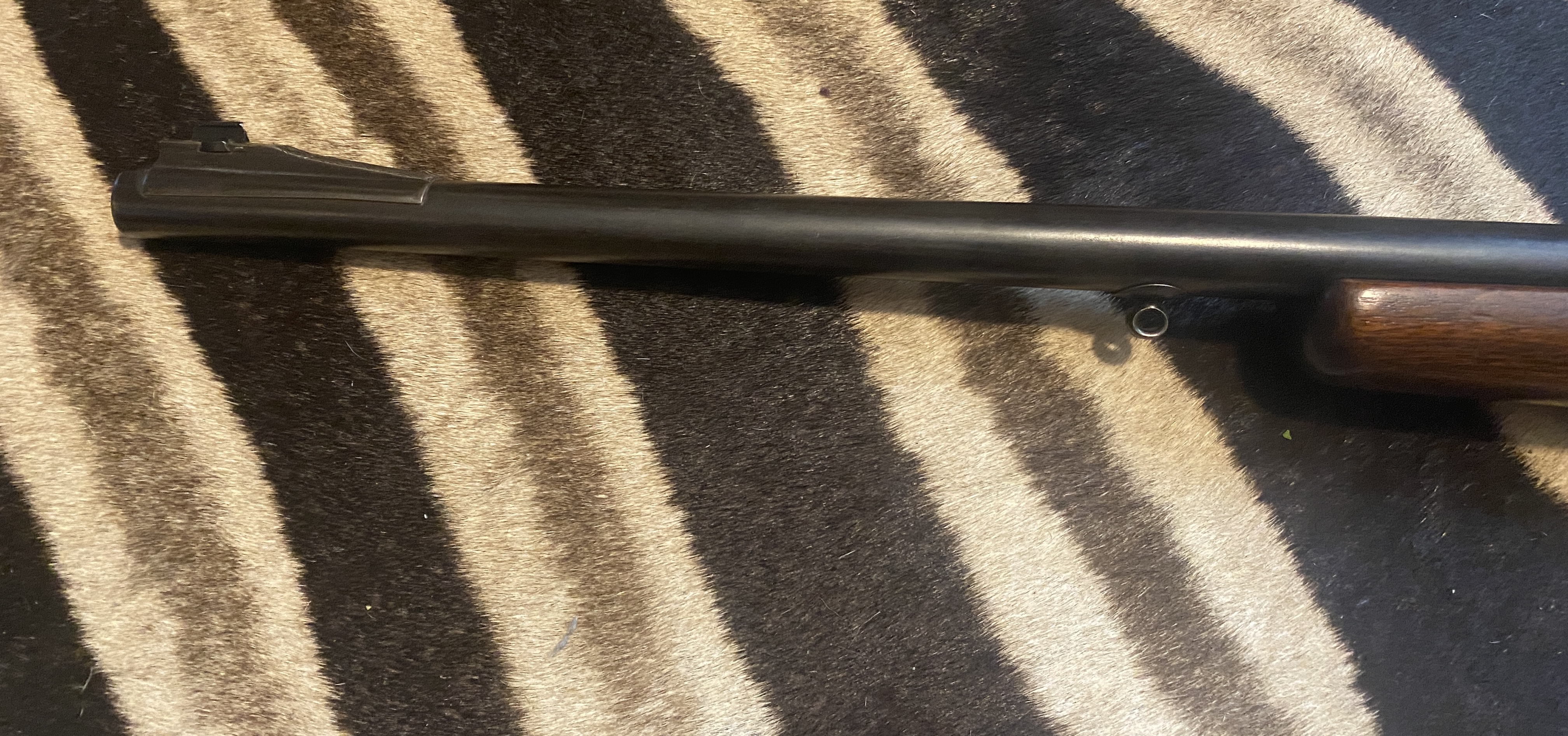 Interesting. Three pins in the stock instead of crossbolts. Do the pins have expanded heads? The barrel is a different looking setup. Is it all one piece or is the flat top chamber section separate? I see someone cut off the knurled knob on the striker. I cut mine off too because I changed to a left hand scope relief wing safety. Couldn't reach around the knob with my thumb. Curious thing is all schematics show the knob and striker rod as one piece. Not originally. The rod is actually threaded through the knob and the two are peened together at the crown. I put my striker in the drill press and used a Dremel tool with cutting disk to cut off the knob while striker was spinning. Almost got the job done when to my surprise the knob started to spin off! It got heated enough during cutting to loosen the "weld." A word of caution to anyone attempting same: most of the threads for striker rod are on the end inside the crown. Don't cut it off short or no threads. Also, the knob is used to reassemble the bolt. Not impossible to reassemble without the knob, but a bit more complicated. I use the edge of my workbench to load the striker in the shroud.