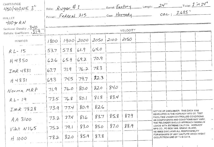 You bet. H4831SC 3.6 inches, Woodleigh 400 grain bullets 75.9 grains = 2052 FPSso far the only load data I can find for the 450/400 NE cartridge is in my Hornady book and the info is pretty limited in there.