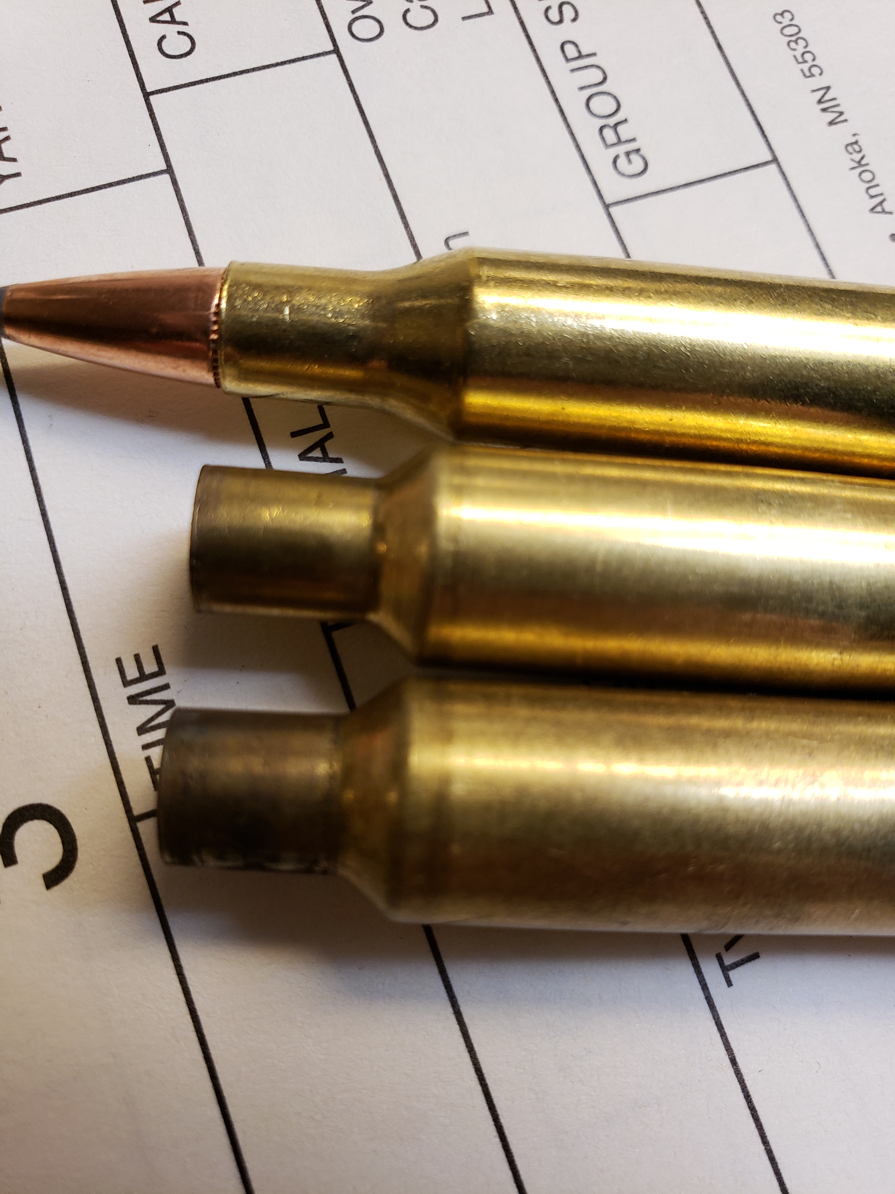Ok, so you chamber the commercially loaded round that's already .005 under, combine that with a chamber depth that's .010 to .015 on the deep side and you get a headspace dimension over that round that measures .100 a full .020 under the gauge. And so you fire that round, The firing pin drives the entire cartridge to the front of the chamber where ignition occurs, the case forms adhering to the chamber walls, the remaining pressure backs the primer out of its pocket until that movement rearward is stopped by the bolt face. The amount of primer sticking out of the center case in your photo line up reveals the exact dimension that cartridge is under size vs chamber depth.