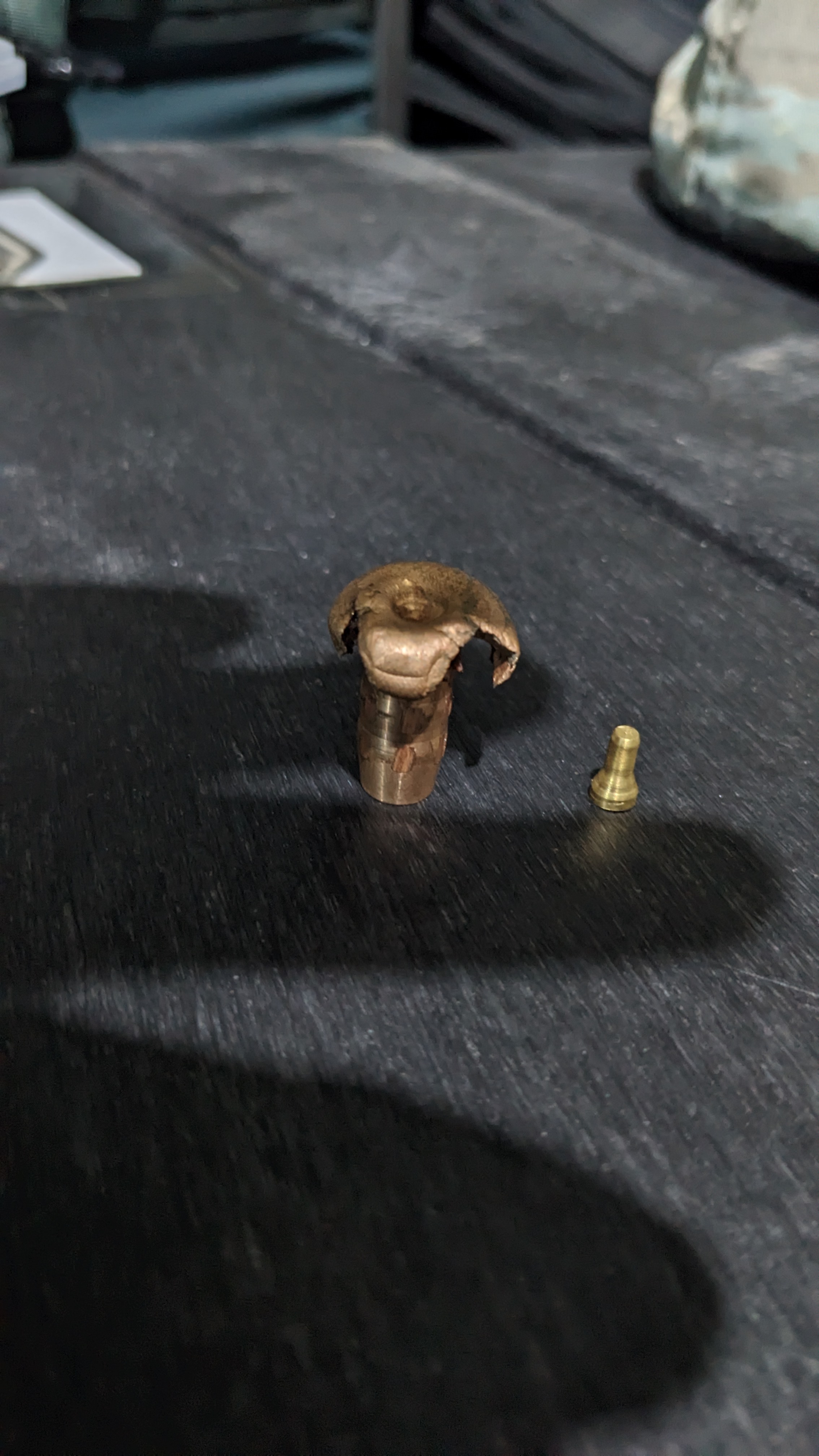 Barnes penetrates well at a wide variety of velocity since it expands less at the slower speeds. Penetrates enough but does less damage at slower speeds. In my case the longer shot at 180y expanded to only 2.0x but still penetrated about 3ft of the Wildebeest and lodged in the paunch. The animal bucked, wheeled, stumbled and ran about 60y and piled up. 1st shot was fatal but we placed two followups for insurance. The 2nd followup was at 60y and hit the neck and was a pass thru. The last was at 10y in the chest and lodged under the skin on the opposite shoulder. That shot expanded to 2.2x and ended things instantly. I was surprised that it did not pass thru. Pic below: The left lower bullet was the 1st shot at 180y and the right one was at 10y. Not that much difference. The 2nd shot was a bit larger than 0.82". That is a big hole.