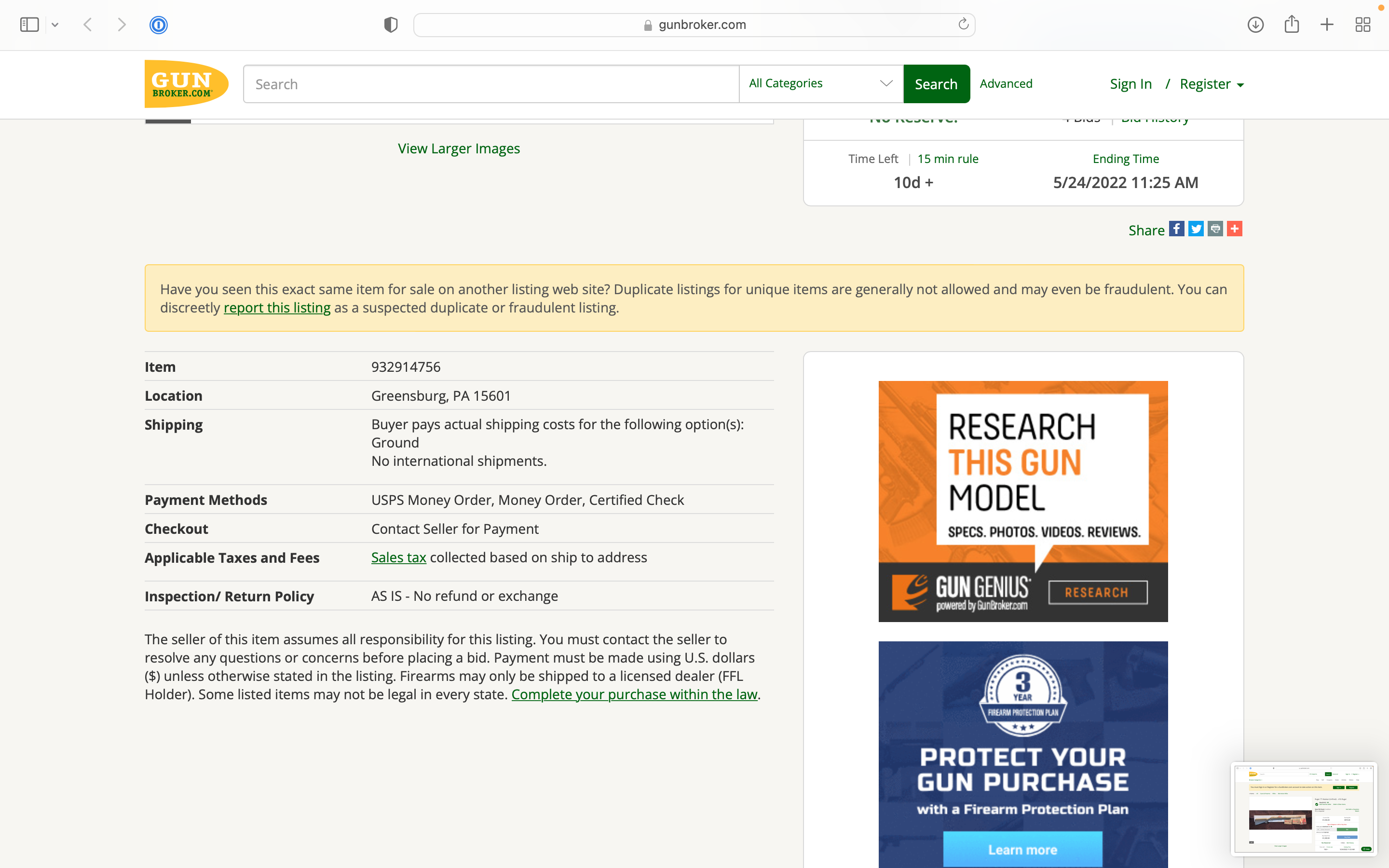Check gunsamerica.com and gunsinternational. com to see if the same gun is listed. GB scammers are good for lifting those ads and posting on other sites. As far as optional photos with today's newspaper or other dated material next to the item, Photo Shop can do that and it's no guarantee the seller is in possession. Armspay https://www.armspay.com/ is an escrow service for firearm transactions. For a sketchy transaction, I'd use it.