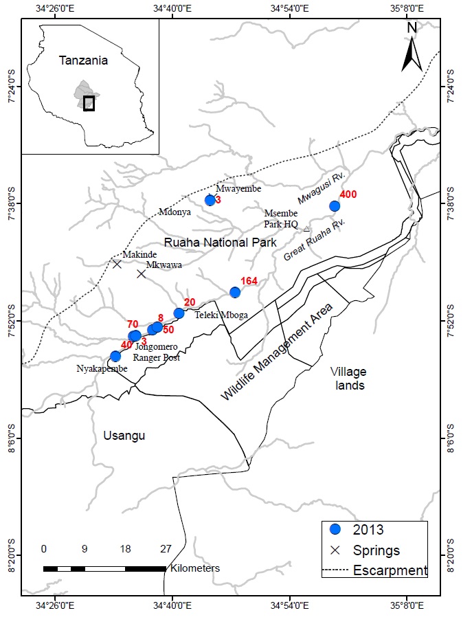 The project’s researchers speculate that while decreased water flows may have caused prior declines, buffalo populations could recover if water flow increases. River flow has slowly increased since the Usanga Game Reserve was added to Ruaha Park in 2008. Continuous monitoring of this trend will be needed to determine how much water flow impacts buffalo populations in Ruaha.
