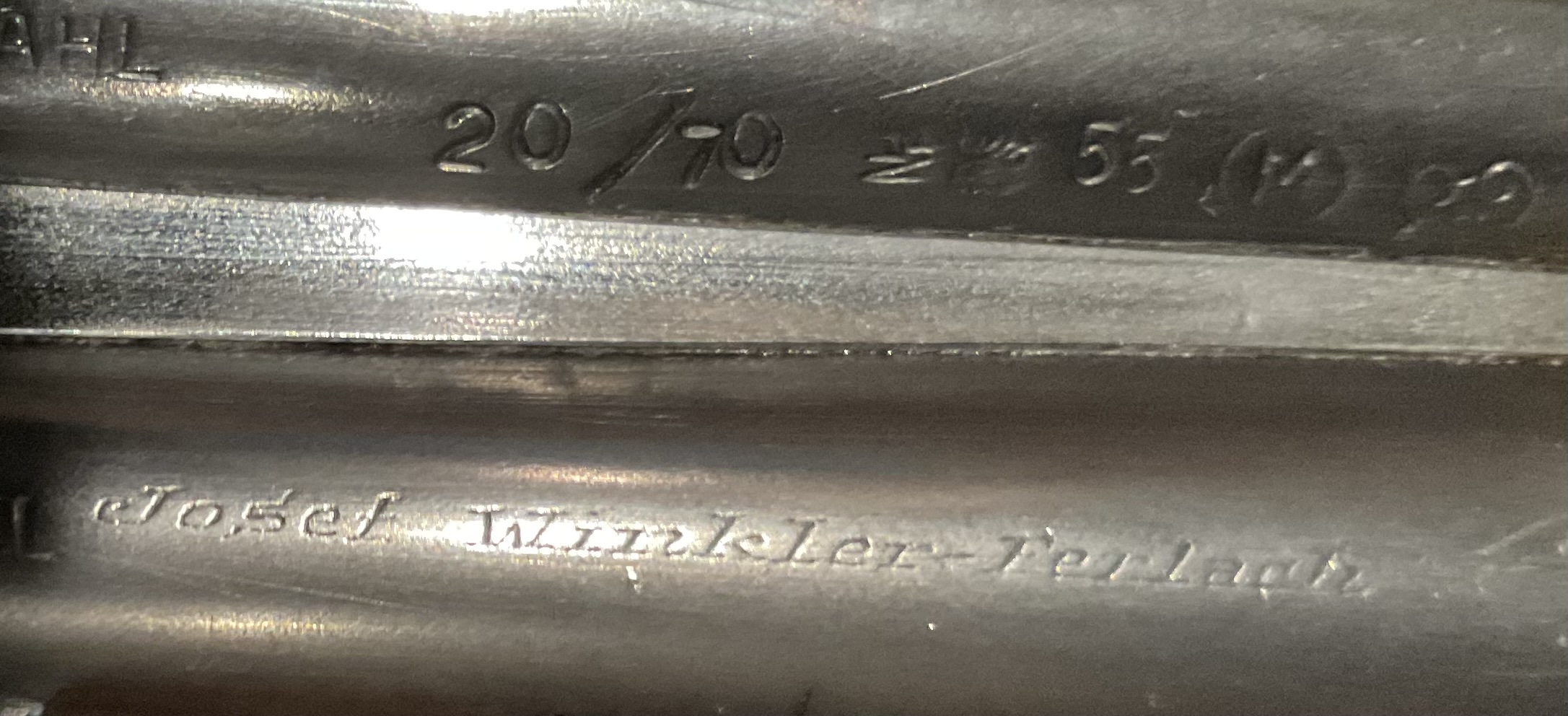 Thanks for comments! It’s definitely Ferlach as a barrel is marked “Josef Winkler Ferlach”. Added another pic of the engraving. Agreed on the caliber choice. Someone somewhere purposefully ordered this combination.In the 1950's German engravers and craftsmen were hard to find because so many had been killed in the war. Many guns of that era have rudimentary engraving as a result. But that does not apply to your gun, as it was decidedly made in Ferlach, Austria where there has never been a shortage of craftsmen or customers. Not only is the engraving of good quality, but the style and layout of engraving outside the game scenes has Ferlach written all over it, as does the carved "bowtie" behind the pistol grip. And, unless my eyes and magnifying glass deceive me (which they don't), one of the proof marks is NP over F which is the Ferlach proof house, which is all the proof you need concerning area of origin. You have a fine weapon in your hands--should be regulated well, and it is a true custom gun. Somewhere in the proofs there will be a number which indicates which shop it came out of--it will be two digits. There is a list of numbers assigned to the different shops which you can google online. Then you will know which house it was sold out of, and maybe find the production number from that year, as well. Congratulations.
