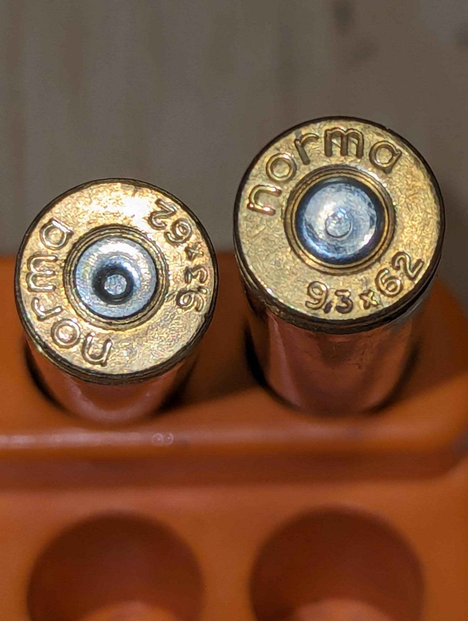 Compare the shoulders on those two cases. If they are the same, then it's not an issue with dies. The primers look different in other respects. Note the dark ring around edge of primer in right case. Is it seated deeper? Different brand?It's a standard CRF, feed from the mag only.