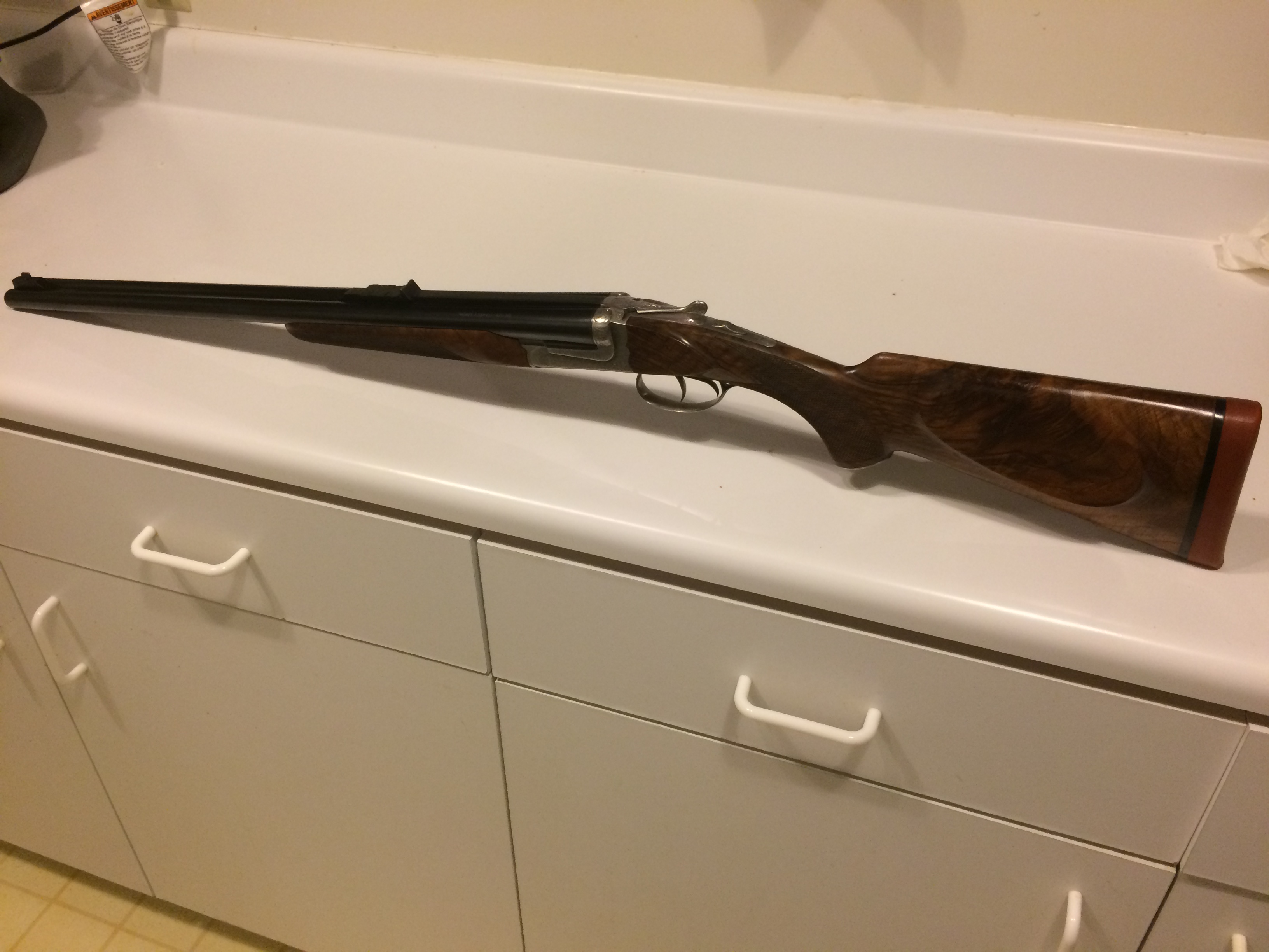 That is really beautiful wood and a fine looking rifle. Congratulations!I just picked up my first double today from my ffl, this has been a long time dream of mine second only to my dream of going on safari. I'm sure this won't be my last double either. It has some wear but is still in great overall shape. I apologize for the photos, I don't have the best lighting. I will snap some more when I take it out to shoot it. It had the regulation targets with it and it was regulated for federal 500 gr loads. I grabbed a box of hornady dgs ammo and have ordered a box of Barnes 500 gr solids. I'm hoping they will group decently. If not I will probably have it sent to champlin arms to have them re regulate it for the Barnes loading. I will probably send it to them either way to install a warthog ivory front sight bead. The current brass one picks up great but in bright sunlight I could see it being a little tricky to pick up. I picked up some snap caps and the triggers break very cleanly, they are a little heavy but am glad they are. The ejectors work perfectly, throwing the snap caps 10 or 15 feet. Unfortunately I have to leave for a work related trip this weekend so I won't be able to shoot it until next weekend. I'm just happy to finally have it in hand!