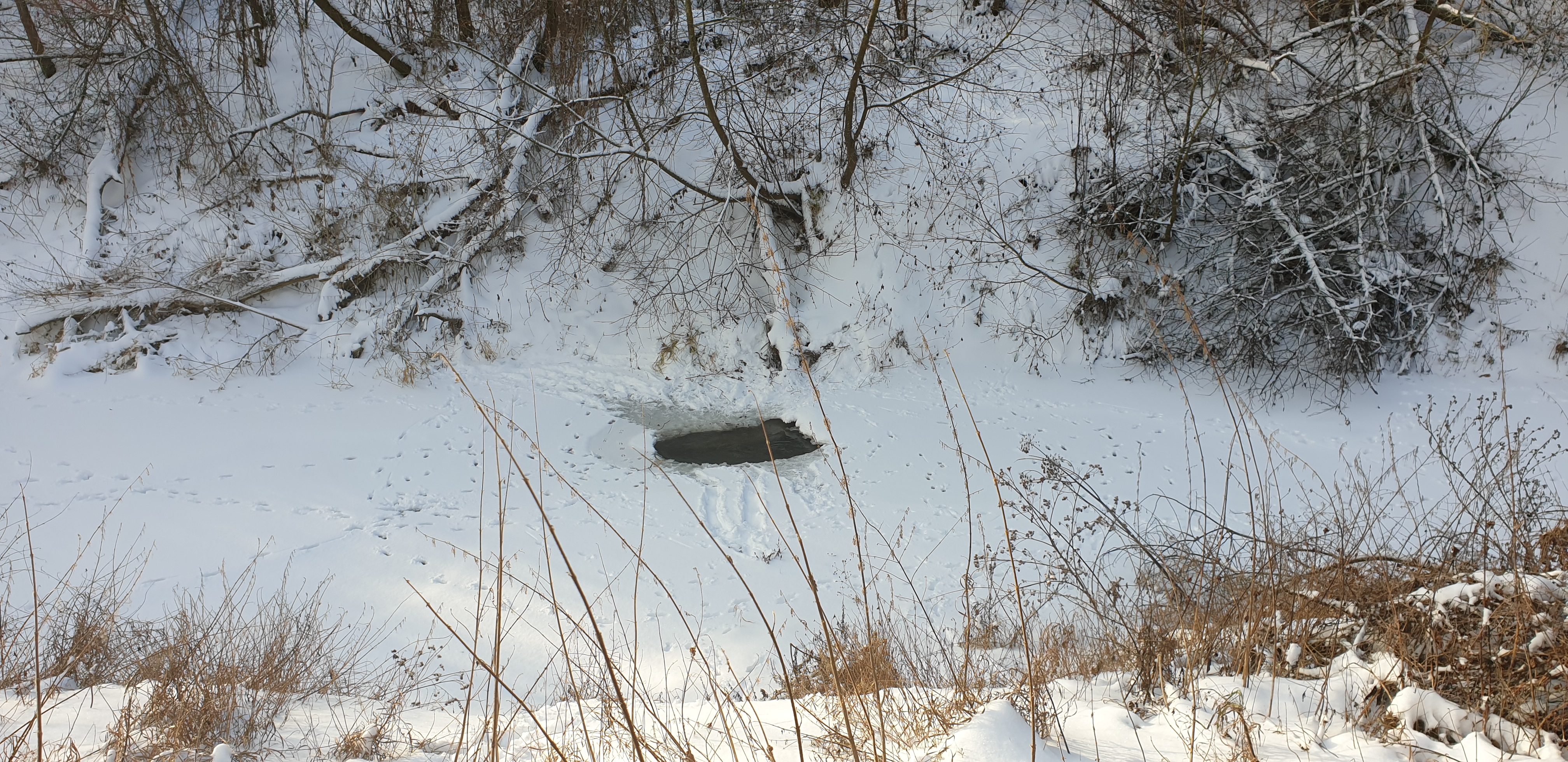 There was a recent thread here about the survival of exotic animals in the cold, there was a perfectly correct remark about the need for a"barn and a chow". But there is a third element, which is very important for some - the availability of water. Not everyone can eat snow. Moreover, even those animals that are adapted to a normal winter, still try to use watering holes. Here I found a recent photo: a washout on a stream. All around are the tracks of beavers that support this hole in the ice, and the tracks of roe deer. The temperature is about -10C.
