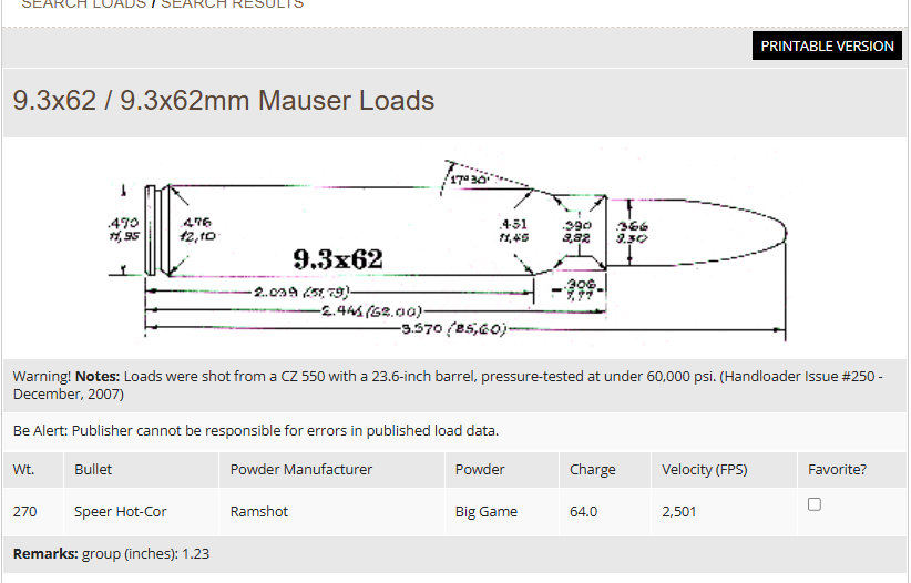 I am using QL to help me with my first reloads for my new 9.3X62. QL says using Ram Shot Big Game powder I can have 65 grains and have a 96.2% fill rate producing 2529 FPS. The case length is correct at 1.19 inches. The problem is 65 grains overflows the case!!!!! I want to use the Speer 270 grain Hot Cor for my leopard hunt but with the above am having problems.