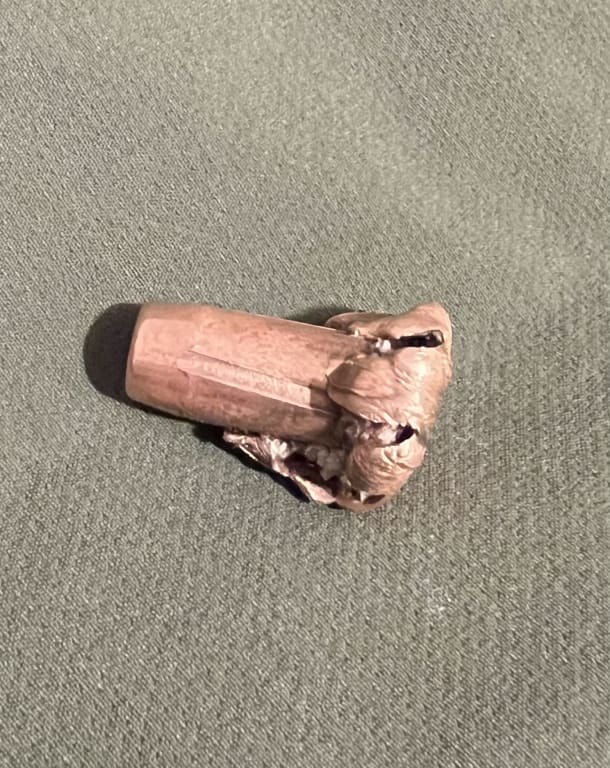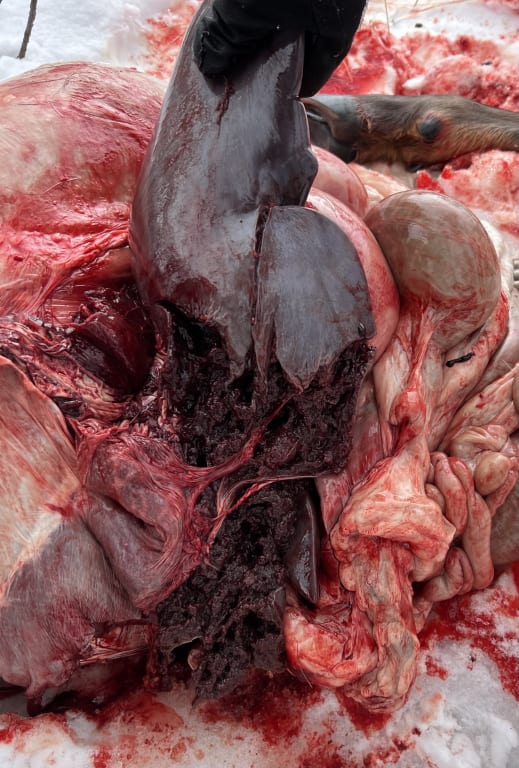 I've loaded the .308 caliber 180gr CX in my 300 WSM X-Bolt since the release of the CX. …This has shot MOA at a couple different powder charges with the H4350… Bullets I have recovered mushroom as advertised by Hornady. Last fall I shot a cow elk at 190 yards. She stepped forward as I pulled the trigger and my quartering away shot turned into a hip shot. The CX obliterated the hip/pelvis, carried on into the abdomen through to the lungs. She went about 20 yards and was found stone dead. I'm grateful I had that kind of penetration because I messed up…The next year I shot a young spike bull at 215 yards, quartering away. The bullet entered at the right posterior ribs, nearly split the liver in half (see photo- you can also see that it had enough hydrostatic force to burst the liver in places), tore through the lung(s), collapsing them and damaging major vessels, leading to a significant amount of blood in the thoracic cavity. I was able to recover it because it continued on to fracture the off-side humerus and dislocate the off-side shoulder. I found it under the skin perfectly mushroomed (see photo). Impact velocity was around 2600 FPS. The elk crow hopped twice, ran about 15 yards, and crashed onto his side, where he stayed down.