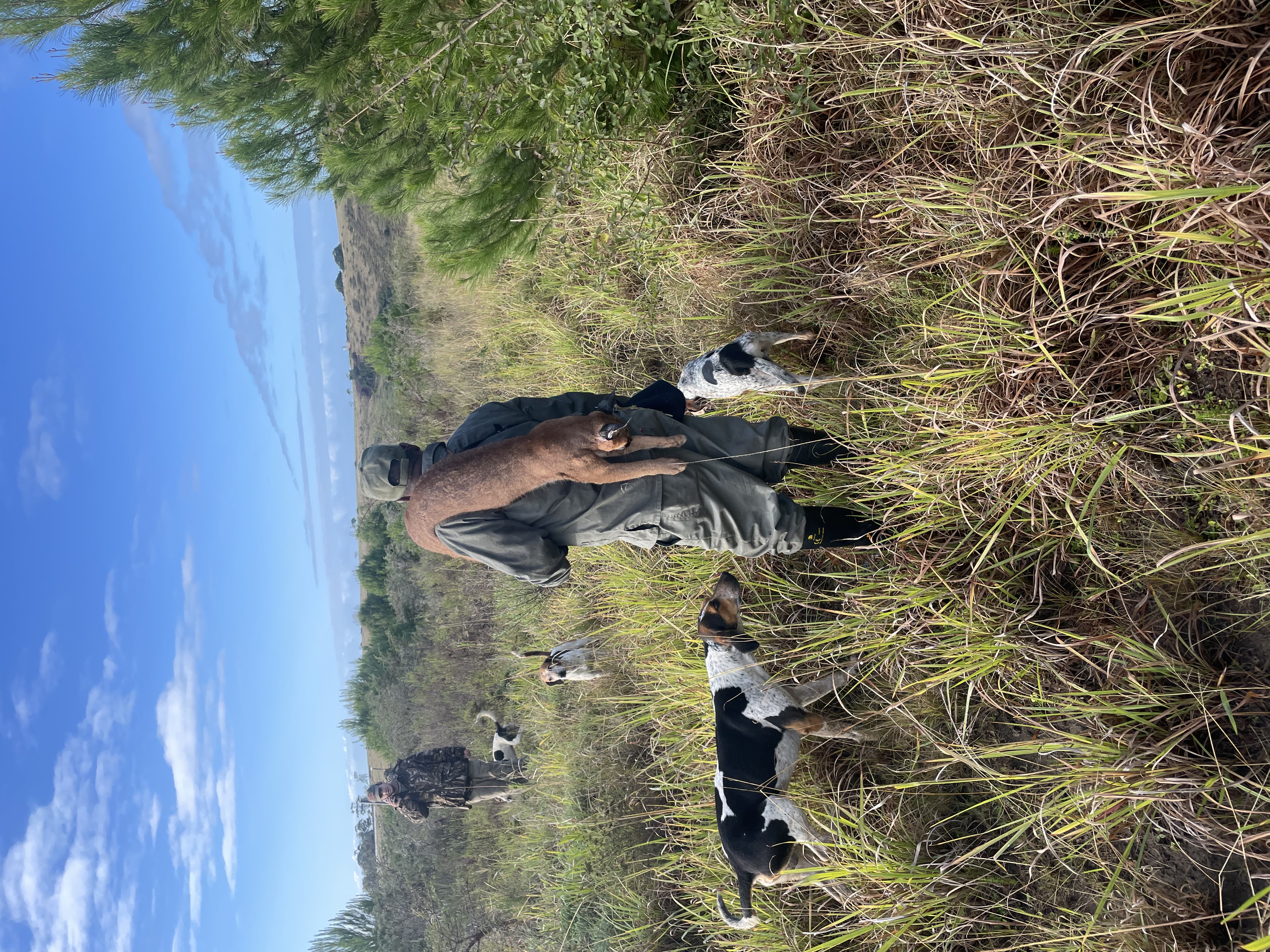 - American Coonhounds (United States) – In the late 20th century, hunters began importing specialized hound breeds from the U.S. to improve scent-tracking of elusive predators. Notably, Bluetick Coonhounds and Treeing Walker Hounds (strains developed for raccoon, bobcat, and cougar hunting in North America) were brought to South Africa and bred. These breeds are famed for their “cold noses” (ability to follow older scent trails) and their tenacity when on track. Gary Miles, a farmer and avid hunter from South Africa’s Eastern Cape, is widely regarded as the father of introducing American coonhounds to the region. In the late 1960s and early 1970s, Miles imported Bluetick Coonhounds from the United States – the first time this breed set foot in Southern Africa. This bold move caused “a great sensation in hound circles” locally, as South African hunters had never seen the high-performance tracking abilities of American Blueticks. Miles recounts that the first American hounds he imported were purchased from renowned breeders in Arizona, and that these introduced lines (originating from houndmen like Terrel Shelley and Richard Holcomb) proved to be “magnificent cold trail hounds” on African game. Importing Blueticks gave him the opportunity to breed the “ultimate” hunting dog for local conditions. He began a breeding program, mixing the American coonhounds with robust local hunting hounds to produce crosses suited for South Africa’s terrain. His objective was not just to import bloodlines, but to develop a pack tailored to African game. Victor Pringle was another well-known hound hunter from the Eastern Cape who made a significant impact on predator control using American hounds. In the 1960s and 1970s, with caracals increasingly targeting livestock, Pringle developed a highly effective pack of hounds to systematically eliminate the predatory felines, and between 1972 and 1975, he and his team removed over 100 of the predators from the Bedford district, keeping detailed records of each hunt, including the sex, size, and stomach contents of the cats. Pringle’s approach combined traditional hunting skills with a focused, methodical strategy, making it a major success in controlling predator numbers. His methods became a key part of the Eastern Cape’s hunting culture, and even today, caracal hunting with hounds remains a popular practice in the region. Pringle’s influence on the hunting culture in the Eastern Cape is still felt, as his work helped shape the way predator management is approached in the area. His legacy lives on in the ongoing use of hounds for predator control, keeping the tradition alive and effective. The American hounds’ superior tracking ability greatly aided hunts for nocturnal, stealthy predators like caracal and leopard. Today many packs contain these U.S. genetics, often crossed with locally bred hounds, yielding hounds adept at trailing aged leopard spoor, or chasing jackal for hours over rugged terrain.