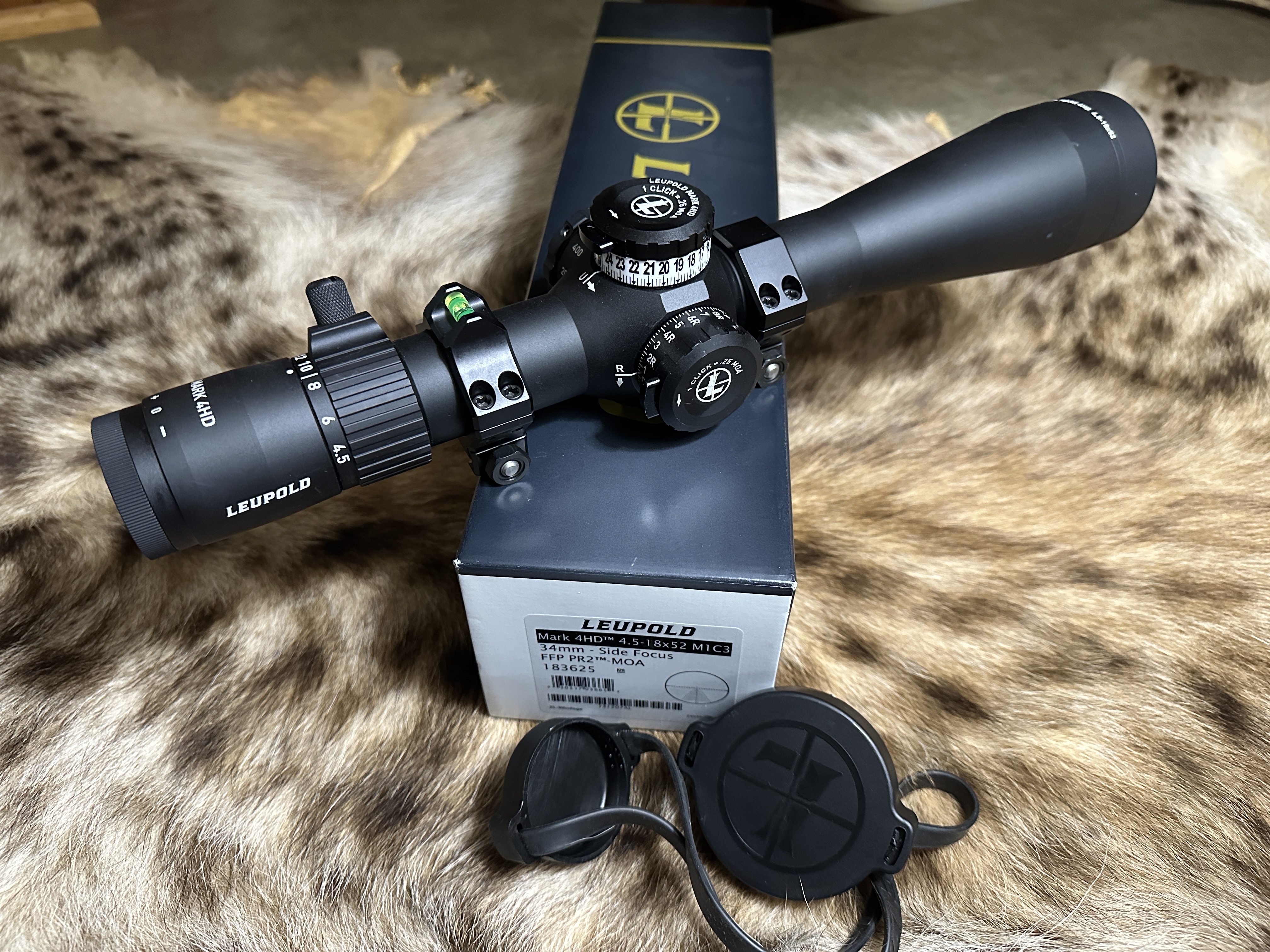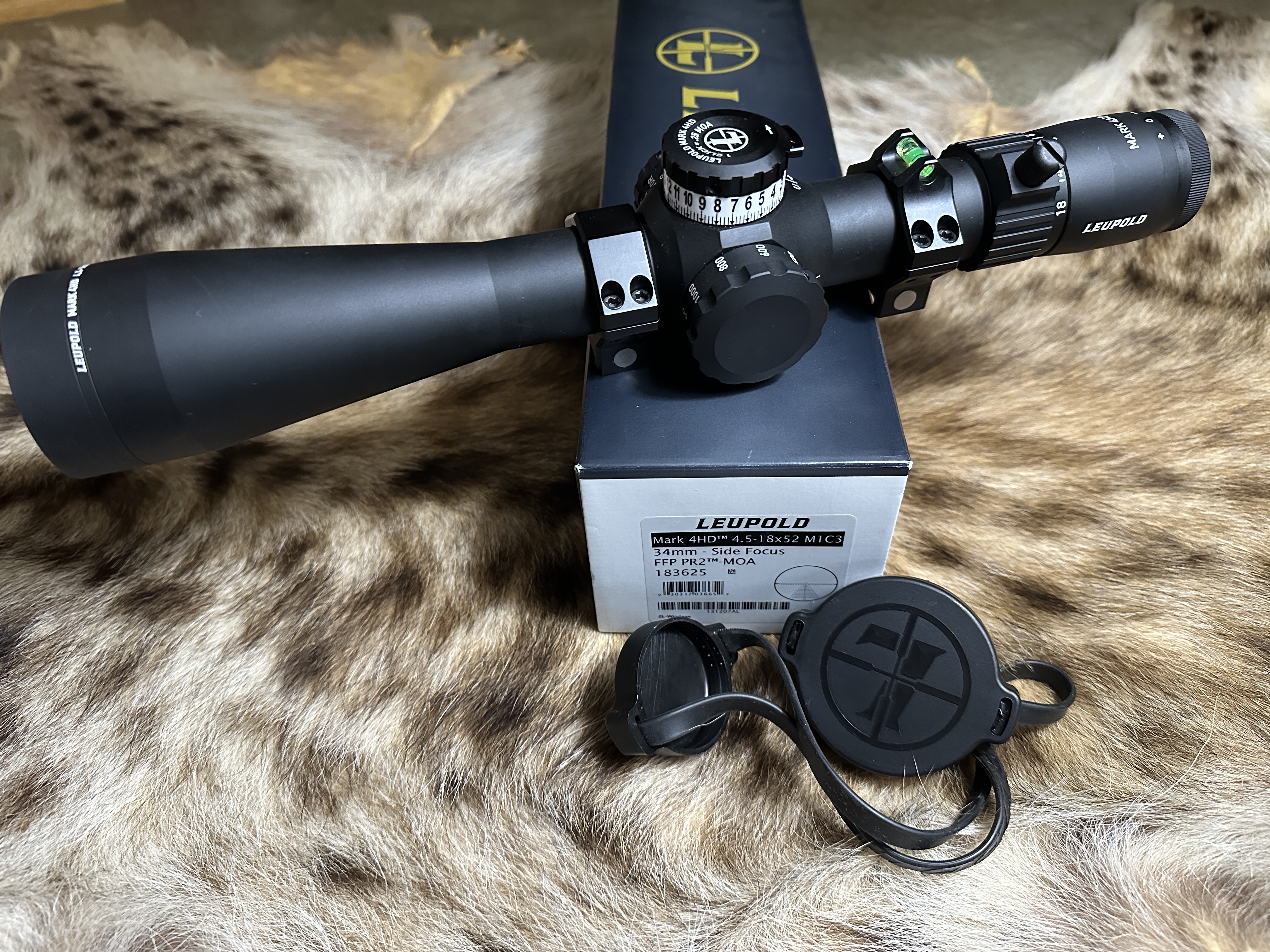 Up for sale is my un-used Mark 4HD. I had long range hunting plans for it. However, changes in my hunting property dictate replacement with a lower power (brush hunting) scope. As a result this great optic is sitting in its box and needs a new home. This is the First Focal plane model with the PR2 MOA reticle. It is mounted in NightForce Ultra Light rings with the bubble level top.