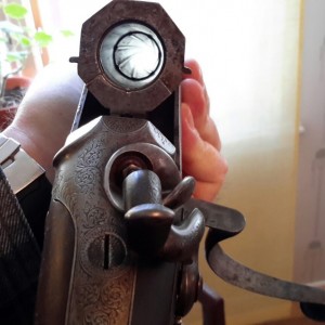 Adams & Co, .577 BPE, 3” chamber. Extra front bead in the grip cap. Stalking safeties (hammers at 1/2 cocked, slide the safety forward to lock the hammers). It’s not a heavy gun at about 9 1/2 pounds, so full power loads will get your attention…maybe like a 12ga 3 1/2” magnum #4 turkey load out of a pump gun.