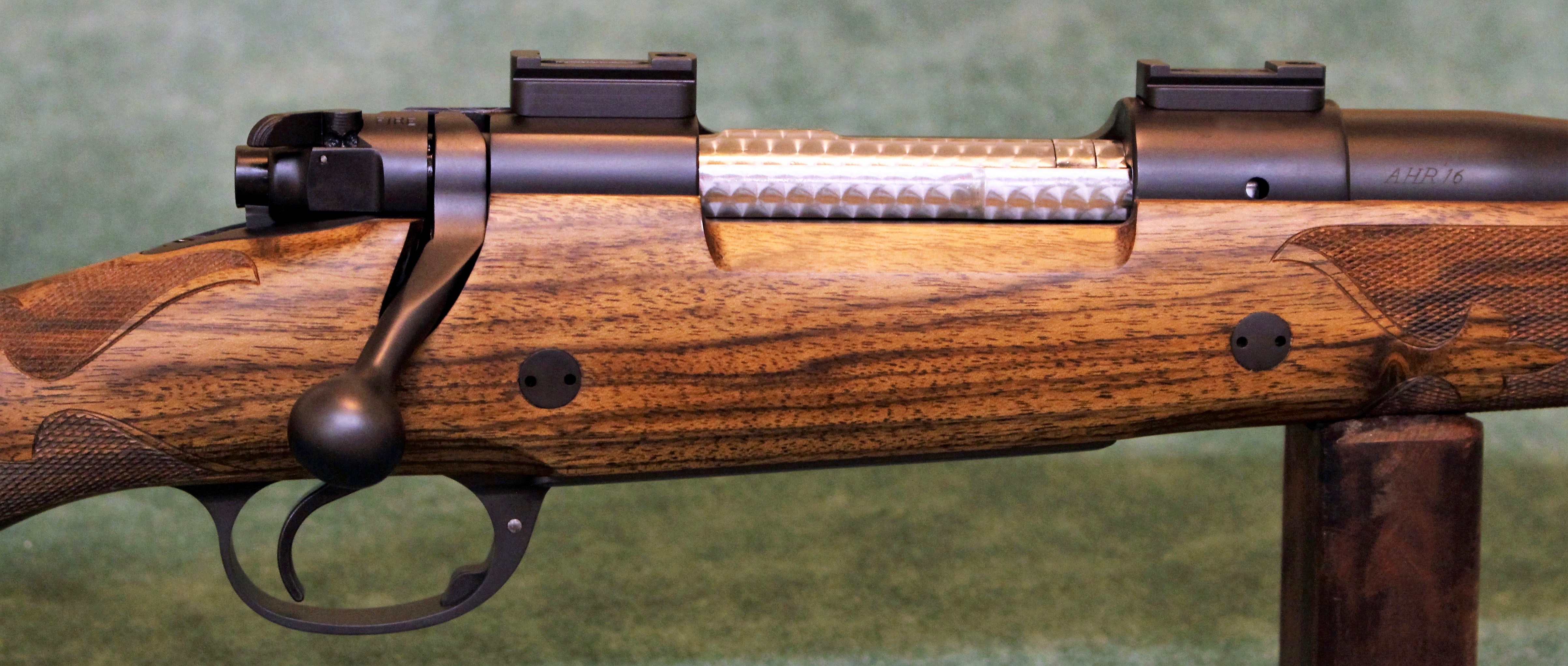 The rifle itself features the original action, that was stripped down to all its bare components for cleaning by myself and re-assembled. I installed a Timney aftermarket trigger (made for the Pre-64) rifles, and set the pull weight to around 2.5 lbs. Wayne then took the rifle and completely reworked/trued the action. He then installed a Kreiger barrel cut and crowned to 24 inches. The bolt stop was removed, and replaced by a Wisner checkered bolt stop. The bolt body was jeweled. As the extractor was an aftermarket extractor, it wouldn't hold the Nitre bluing like I wanted, so we elected to go with a jeweled extractor instead. NECG rear and front sights were installed, along with a barrel band front swivel. The metal was finished in a matte, hot-blued finish. Finally the rifle was stocked in a AAA piece of English walnut with 24 lpi wrap-around checkering and Fleur-de-Lis accents. It was cut to my LOP, and finished with a red Pachmayr Decelerator recoil pad, and has a blued and inletted rear sling swivel. Overall, the rifle feels trim and svelte in my hands, and point well. Unloaded and un-scoped, it weighs in around 9 lbs. I plan to install an Leica ERi 2.5-10 x 42 scope with the 4a reticle in detachable Talley rings.
