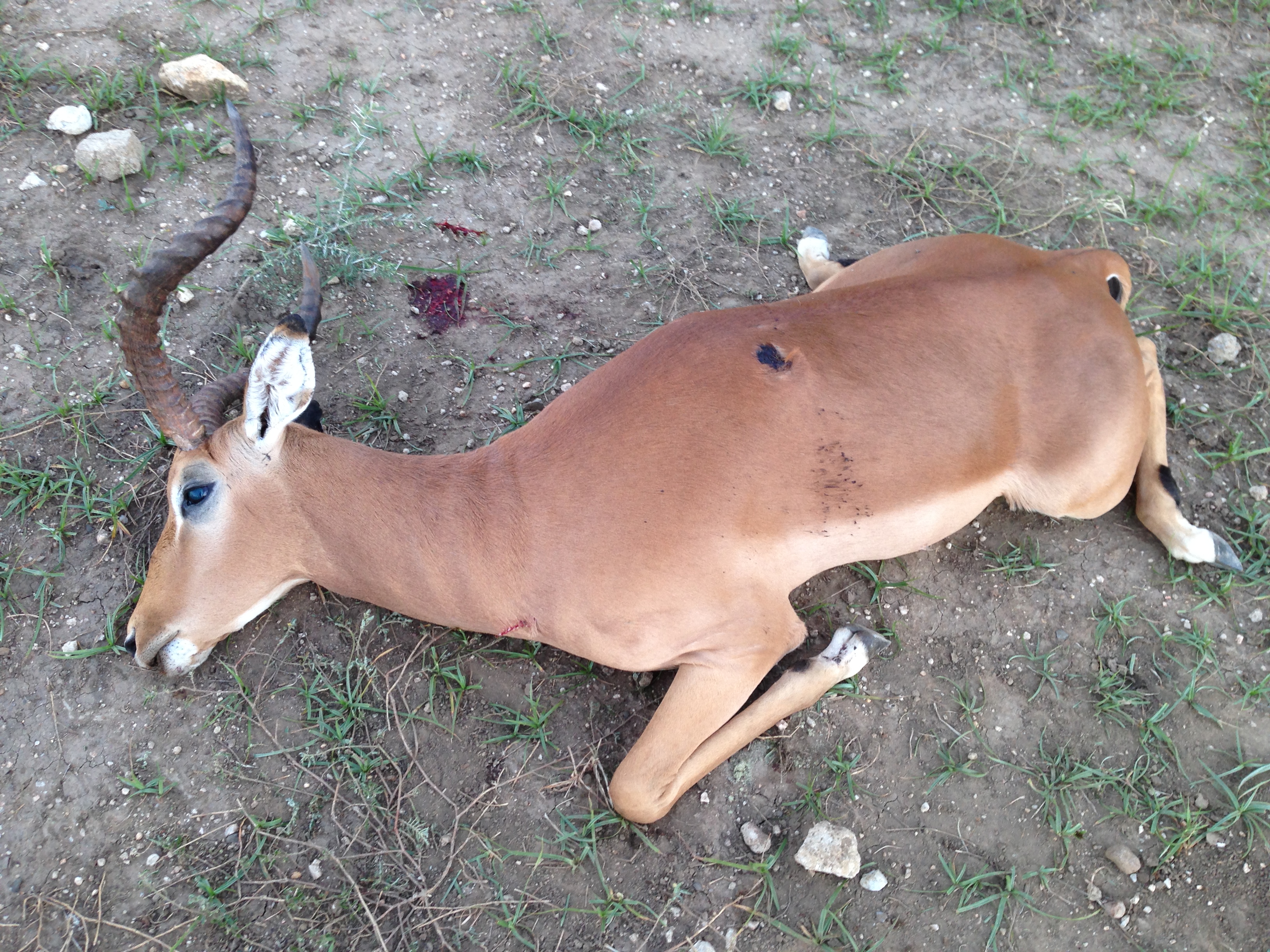 Day 8 was an interesting day on a different property (with nothing shot), so Day 9 we returned to the property that I muffed the shot on the impala. After lunch, we decided we would sit in a blind overlooking a water hole for the rest of the day. It was definitely not an action-packed day! Besides the constant background noise of the doves and francolin, there was a pair of Egyptian geese at the water all day. They were the first I had seen and were very beautiful. A lizard in a tree entertained me for a while. Then a gorgeous waterbuck came in to drink. I was able to watch him for about 10 minutes before he left and my trigger finger itched the whole time! However I did not have sufficient trophy fee funds remaining and let him walk. A little while after that, a warthog came for water and then grazed for a while. The geese and the warthog apparently didn't care for one another, which was funny to watch. Finally, at the end of the day, I spotted a single impala ram emerge from the brush to our right. He didn't head for the water, but was walking straight at us like he was on a string. Finally at about 30 yards, he turned broadside and the instant Nicola told me to shoot, the ram dropped in his tracks.