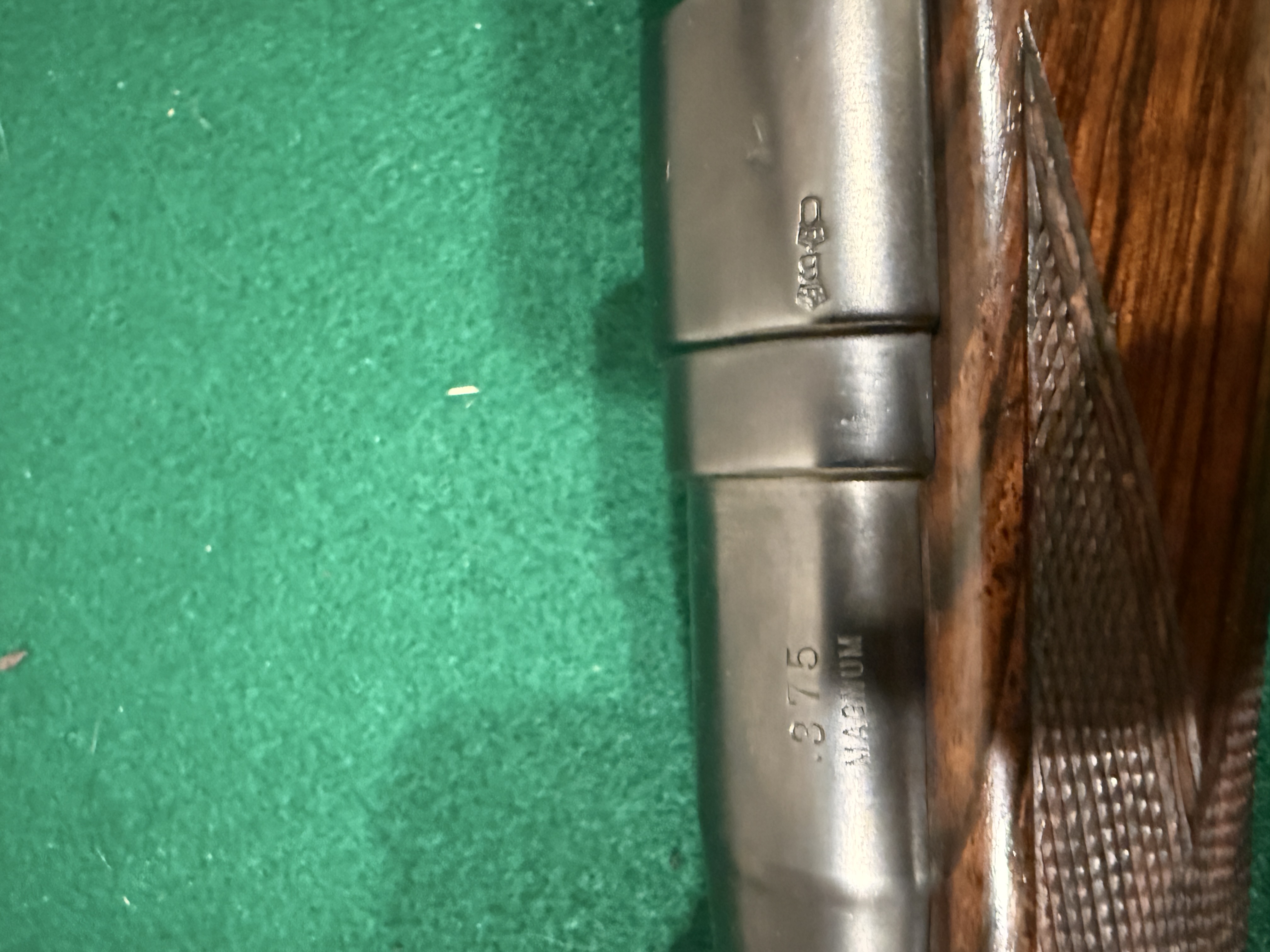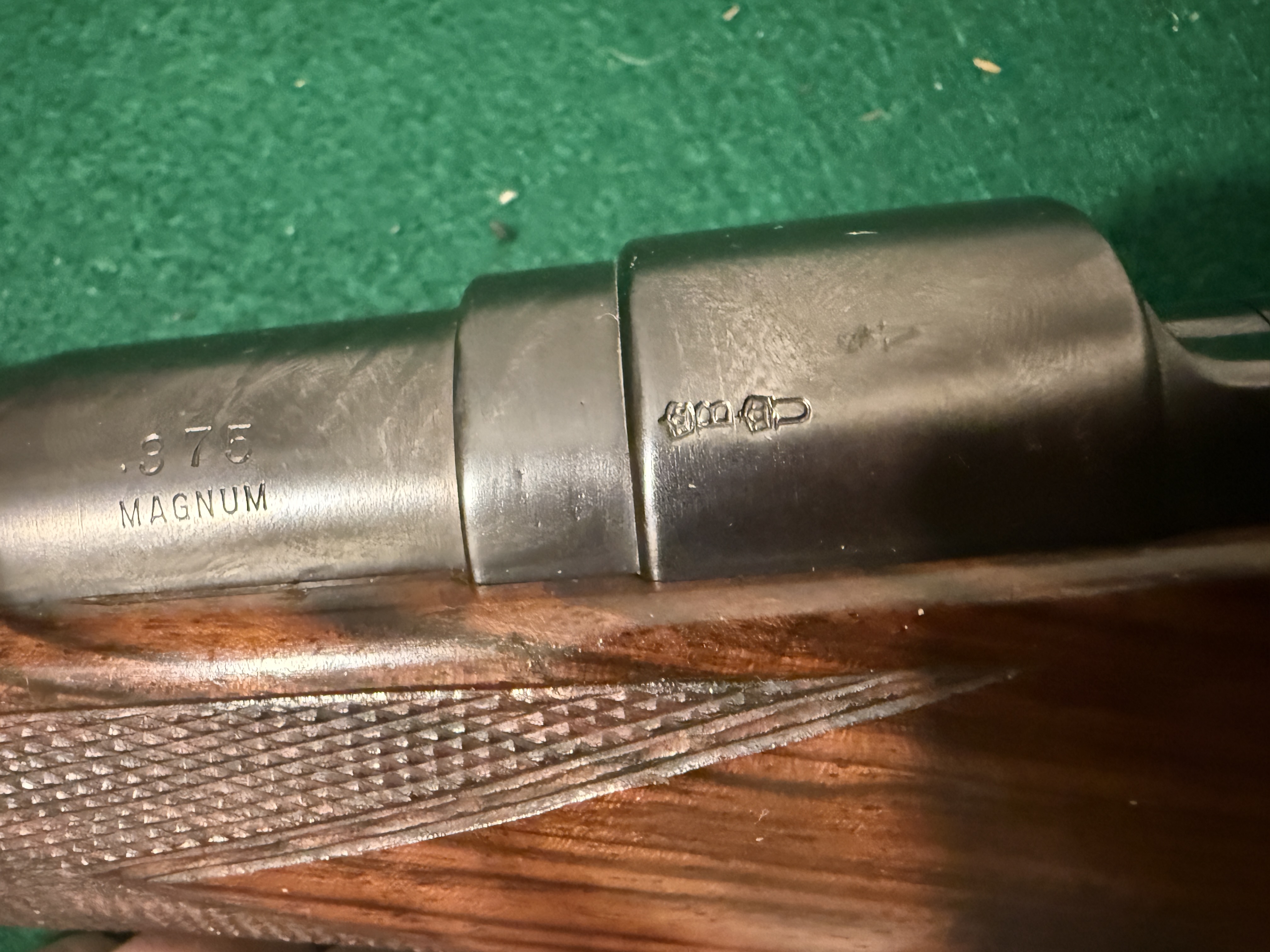 I'm hoping some of you experts can lend a hand. I purchased this 375 H&H earlier this year with the M98 action. When I bought it I was told it was a Rigby; however, there are not name marks on the rifle. I was able to purchase for what I think is a fair price thinking it may not be a Rigby. The wood and gold "SAFE" is what caught my eye. Below are pictures of the proof marks and serial numbers. Note the serial number for the bolt does not match the serial number on the trigger guard. Thoughts?