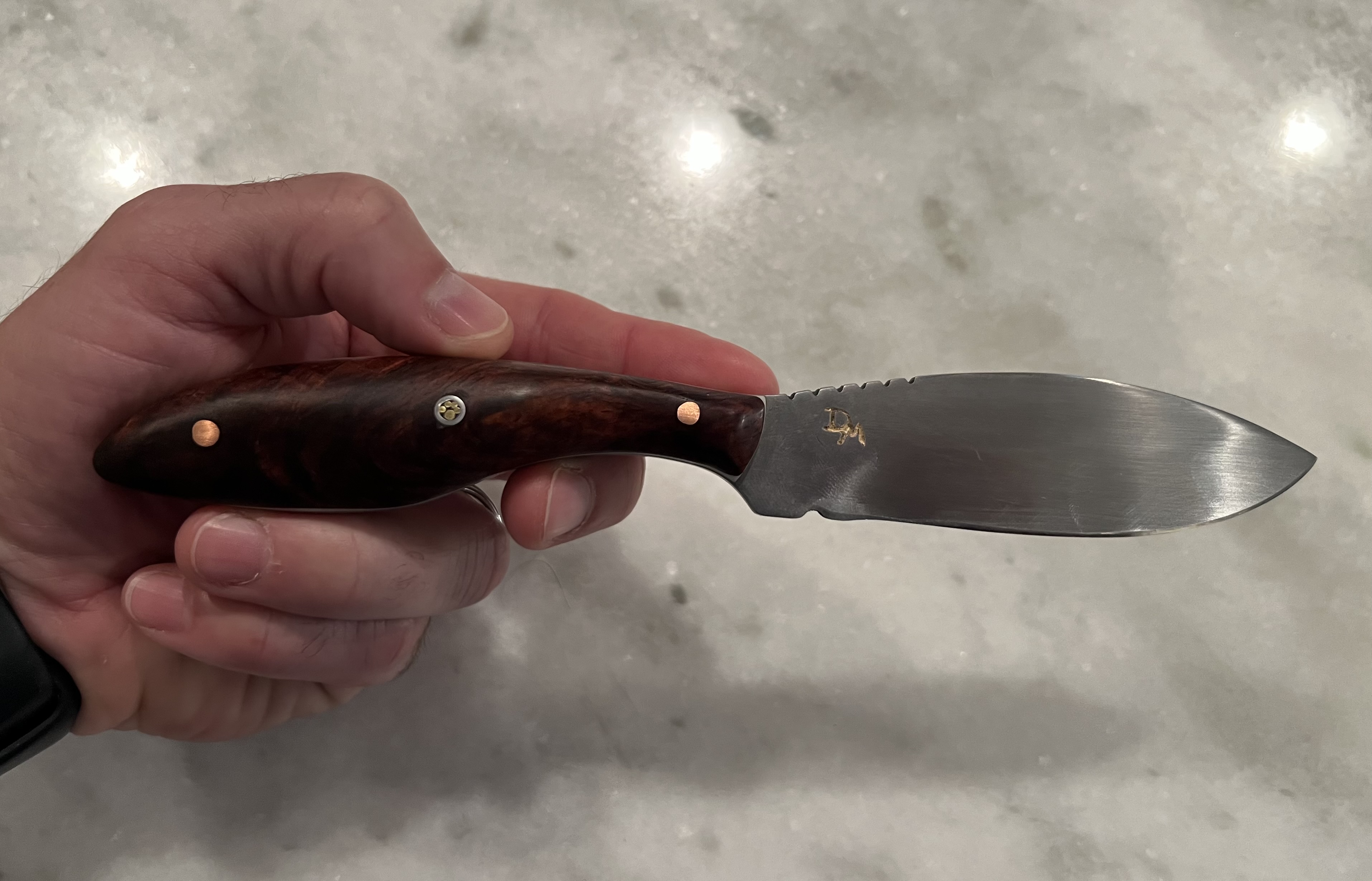 My father and I have always been big fans of Canadian Belt knives when it comes to skinning game. We have had a couple over the years dating back to one purchased by my grand father. Well, my dads birthday is coming up and I found a local custom knife maker to make one for him. I was able to have input on the blade shape, handle material, tang spacer color even the handle pin material. I am very pleased with the way the knife turned out and will likely be getting one for myself here shortly.