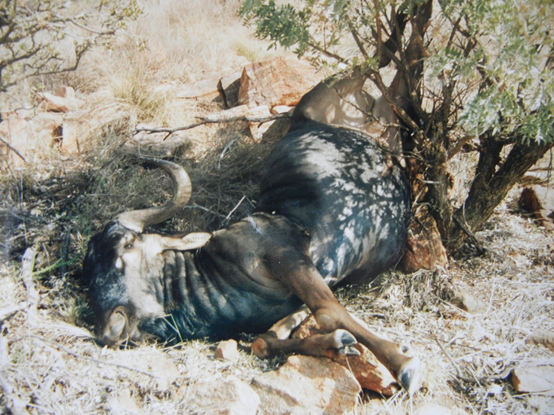 Blue wildebeest wounded by client and followed up and shot with the “Poor man’s double” and Brenneke slug.