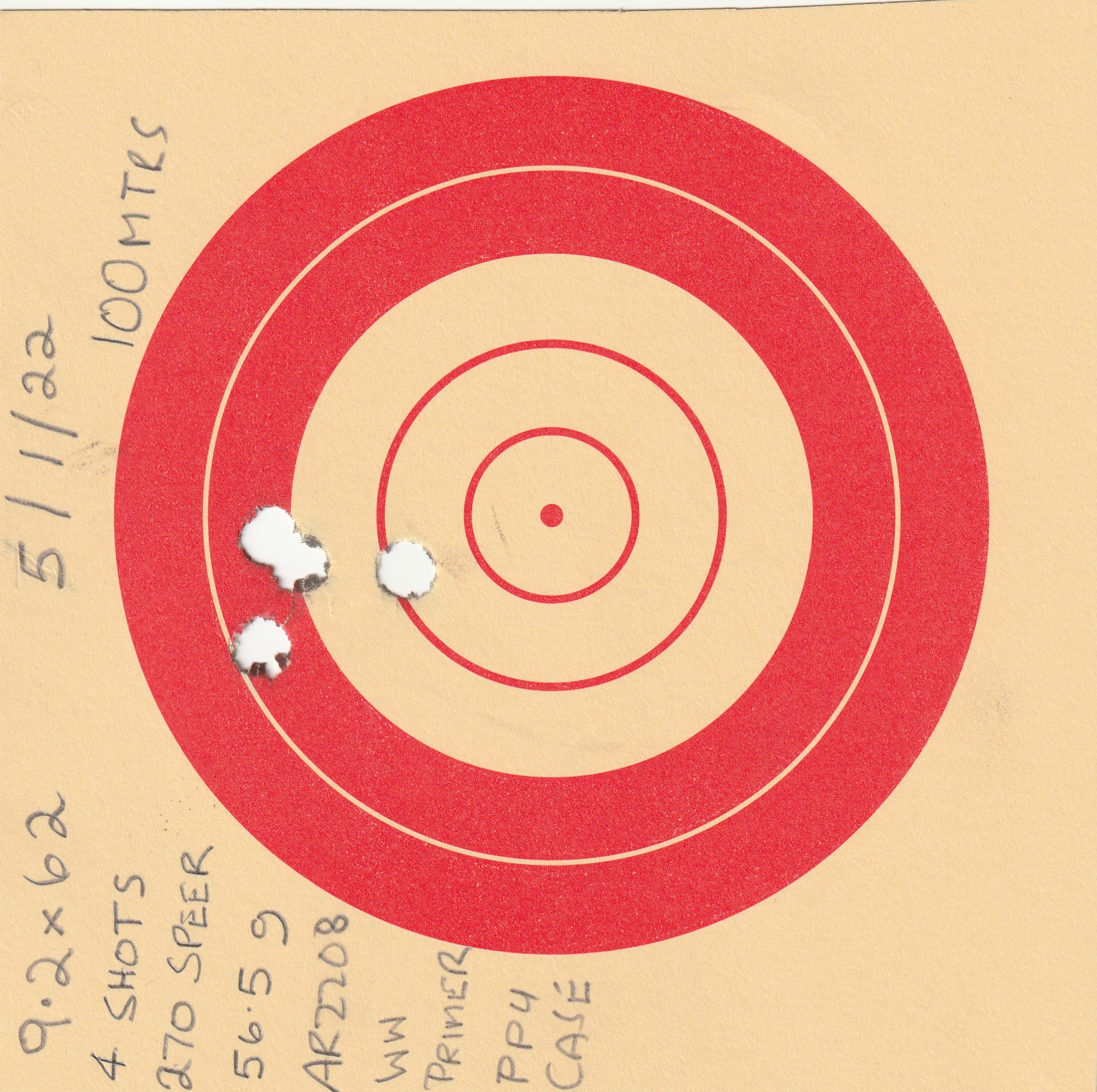 My 9.3x62 build is at the go & shoot it stage, it looks ok, may fiddle with bedding & re test before i rust blue& finish stock all shots at 100 meters, i fired 24 shots in about 1 hour shooting my 308 in between& that was about enough in one session recoil from bench is not excessive but makes the 308 feel like a 22. the person at the next bench happened to have a factory Ruger 77 9.3x62 he was shooting Barnes 250 grain reloads with AR2208 powder & shot a couple of 3 shot clover leafs. the bottom picture is PPU 286 grain factory ammo ,the scope is an old Leupold M8 4x