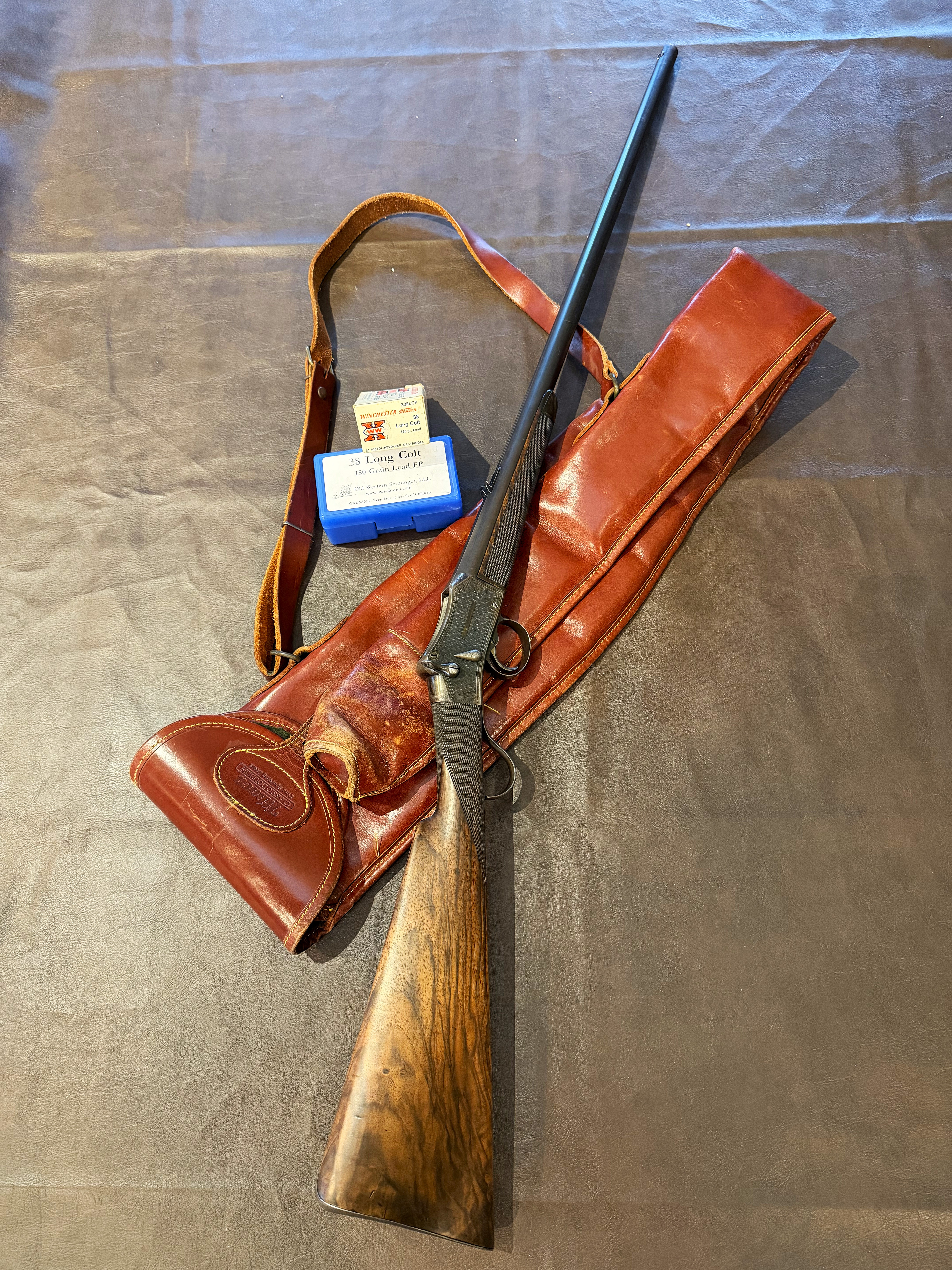 This is my exquisite little 380 Rook by Stephen Grant. It was built on a miniature Martini-Henry style falling block action. Though not always interchangeable, because the rook used a heeled bullet and slightly shorter case, this particular rifle happily shoots 38 Long Colt ammunition. With my eyes, it is minute of armadillo accurate to forty or fifty yards. This rifle would have been built around 1890-1900.