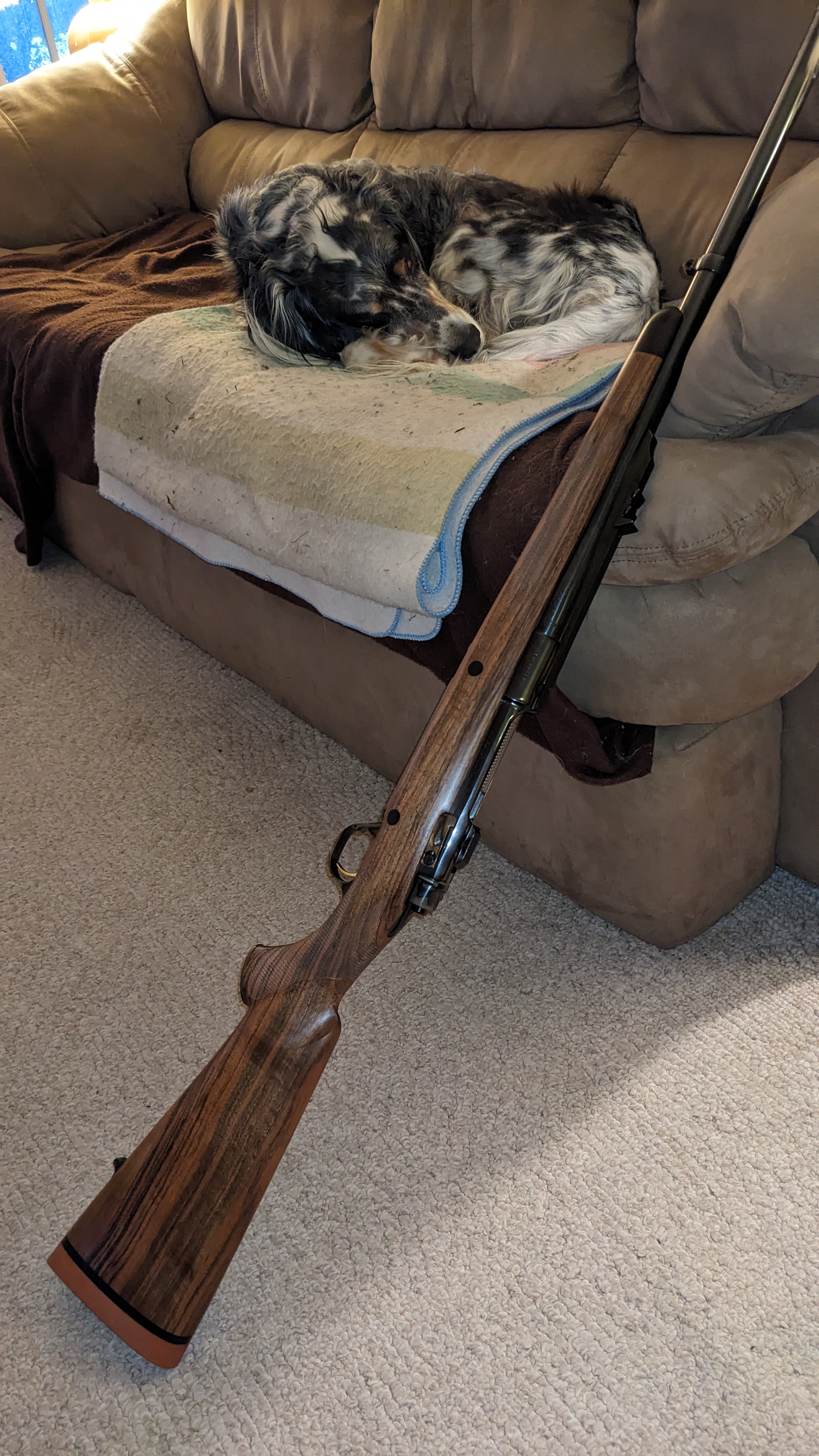 Good looking dog!I totally agree about the weight and balance of the 375 RSM. I knew this before getting one but was hooked on what to me is a classic Safari rifle. I ended up putting another $2k in custom work into it and ended up with a too heavy 375 that shoots like a dream.