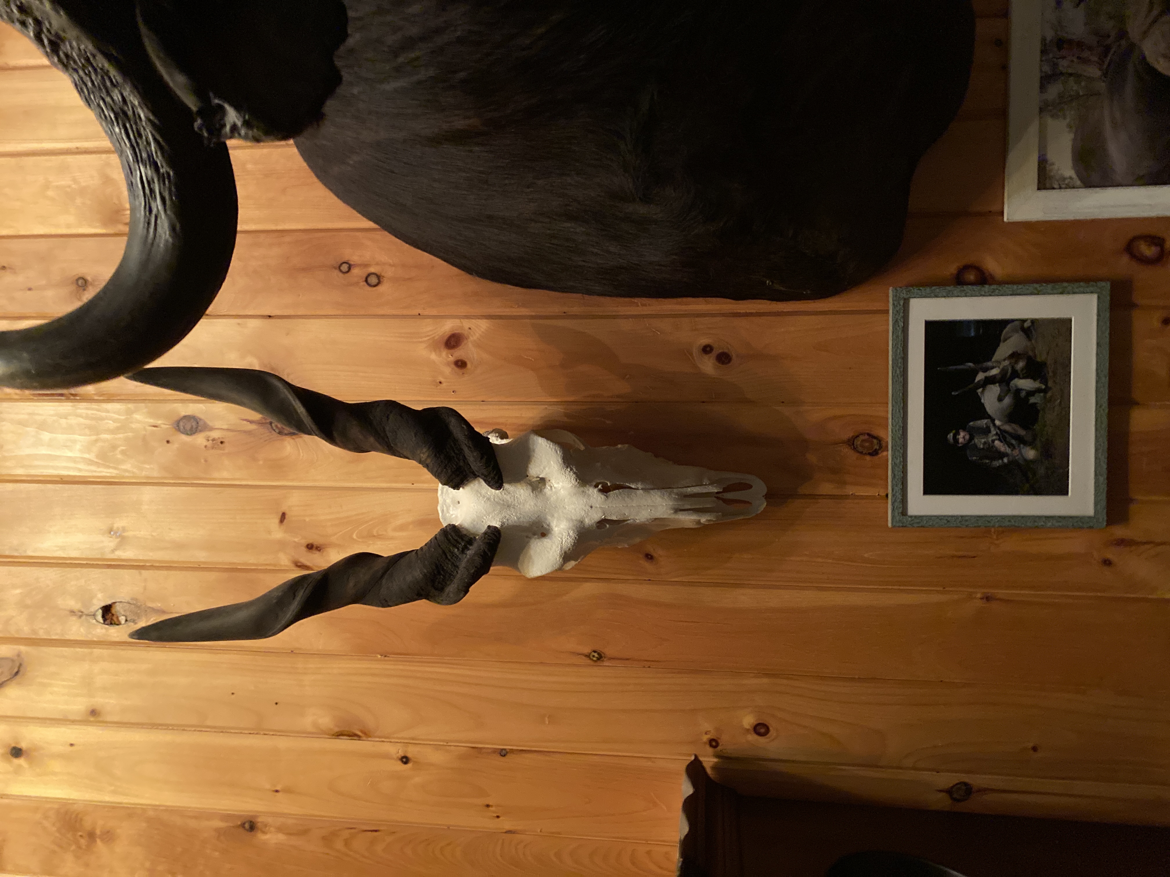 But, a NICE, BIG old mature blue bull will also have quite a mop of hair on its head and a HUGE dewlap, not to mention huge-based, worn off tipped horns. Def takes up room, but they are beautiful. A collection of spiral-horned mounts (i.e. did the S. Slam in Zim/SA-eland, kudu, nyala, bushbuck) look quite good arranged together properly on the wall!I would choose kudu over eland. An eland shoulder mount is huge! And they are almost hairless which can be a challenge for taxidermist if cape is even slightly damaged. Not particularly pretty either. Go with a euro for them. Hands down. Black wildebeest make an "interesting" shoulder mount for sure. They are difficult to prepare for euro due to shape of horns. Consequently, African taxidermists frequently overcook the horns.