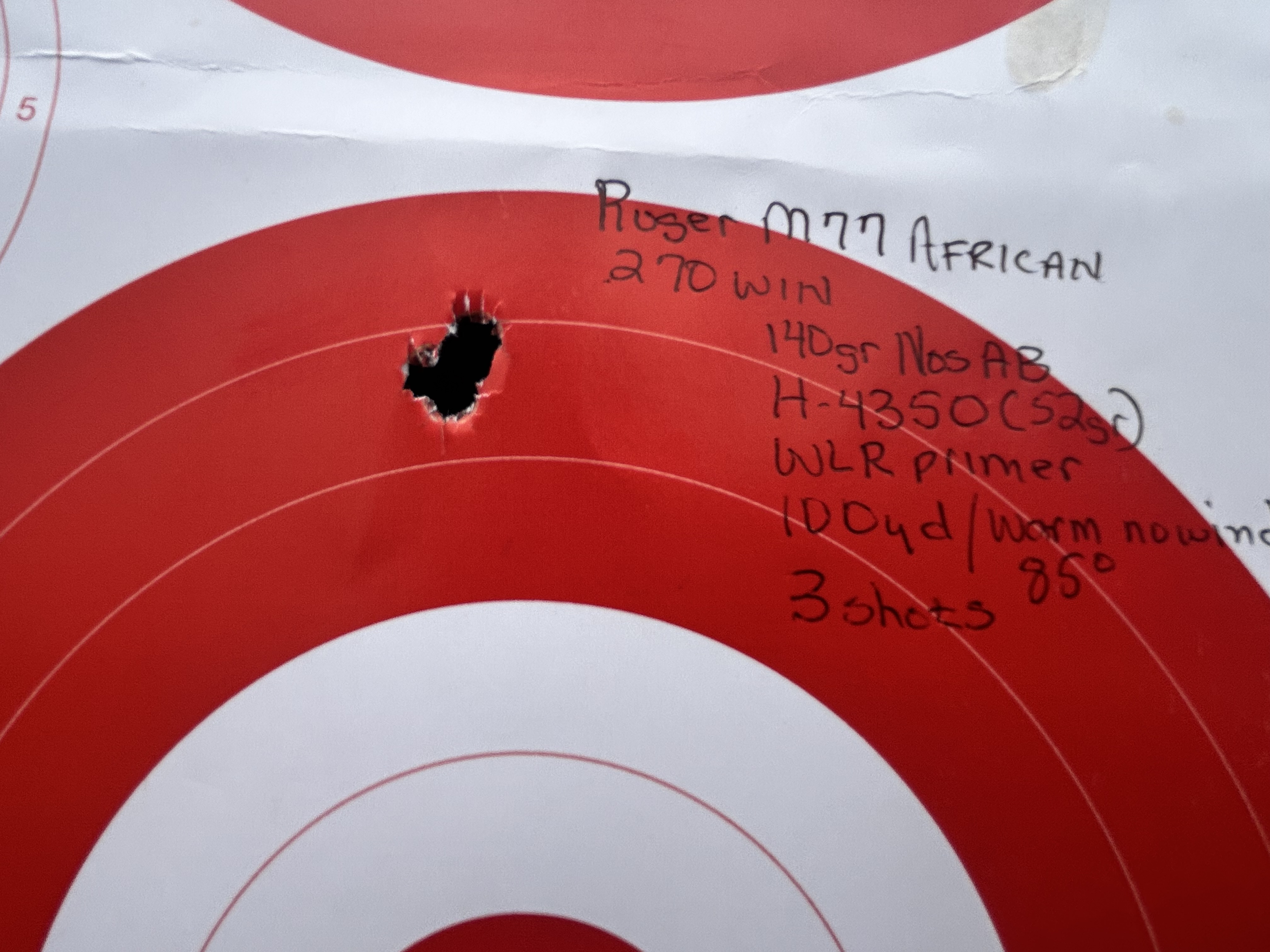 These are two 100 yd groups with my 270 African. They are both 140 gr loadings; the tight group was with a fine-haired Swaro I use to develop loads while the second was with a 1-6 heavy duplex scope I use for “hunting”. I love the rifle but wish it wasn’t so heavy…close to 9 lbs with a scope.