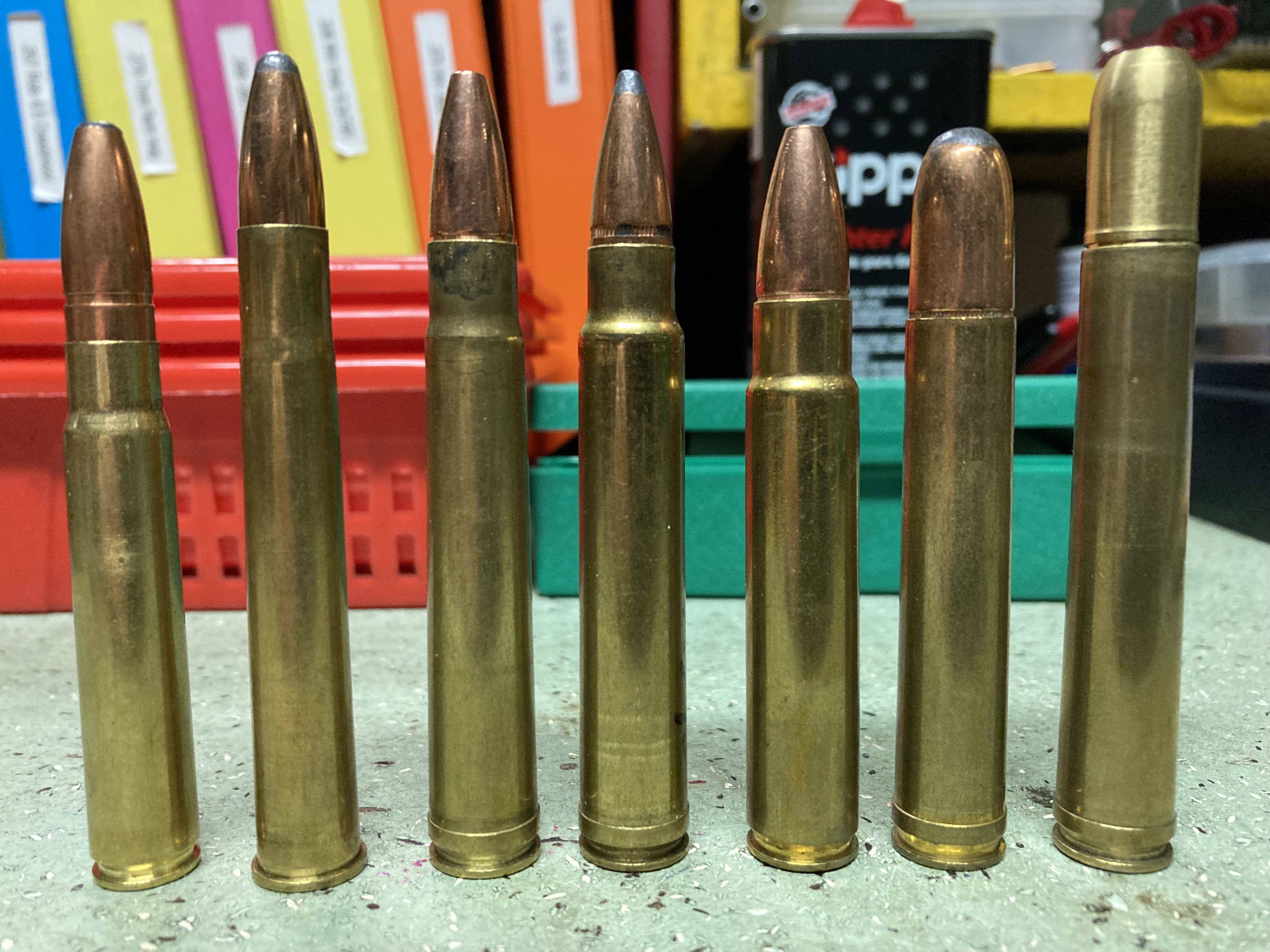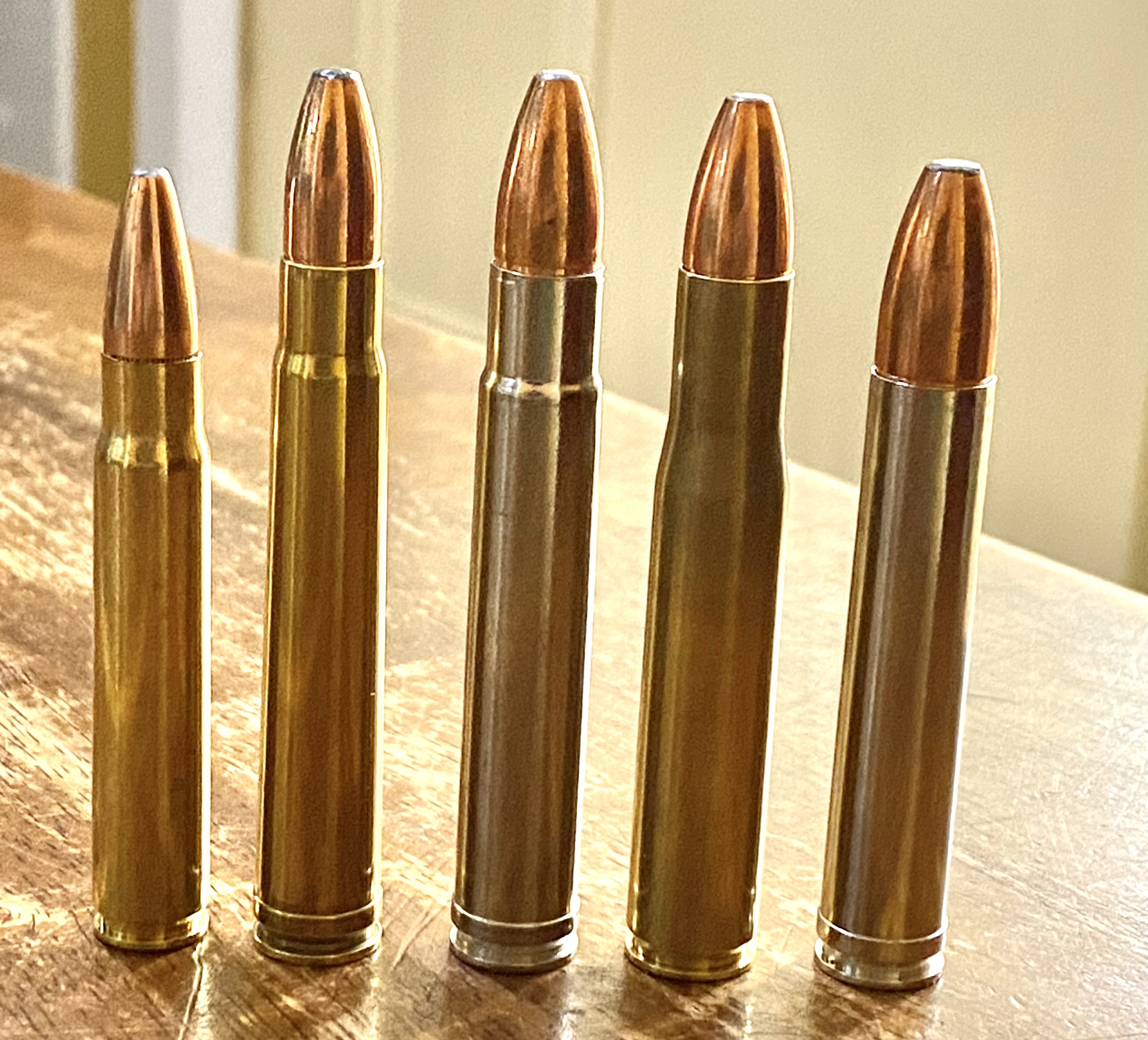 Pictured here, those two would be the .35 Whelen (middle) and the world’s first short magnum, the .350 Remington Mag (right):