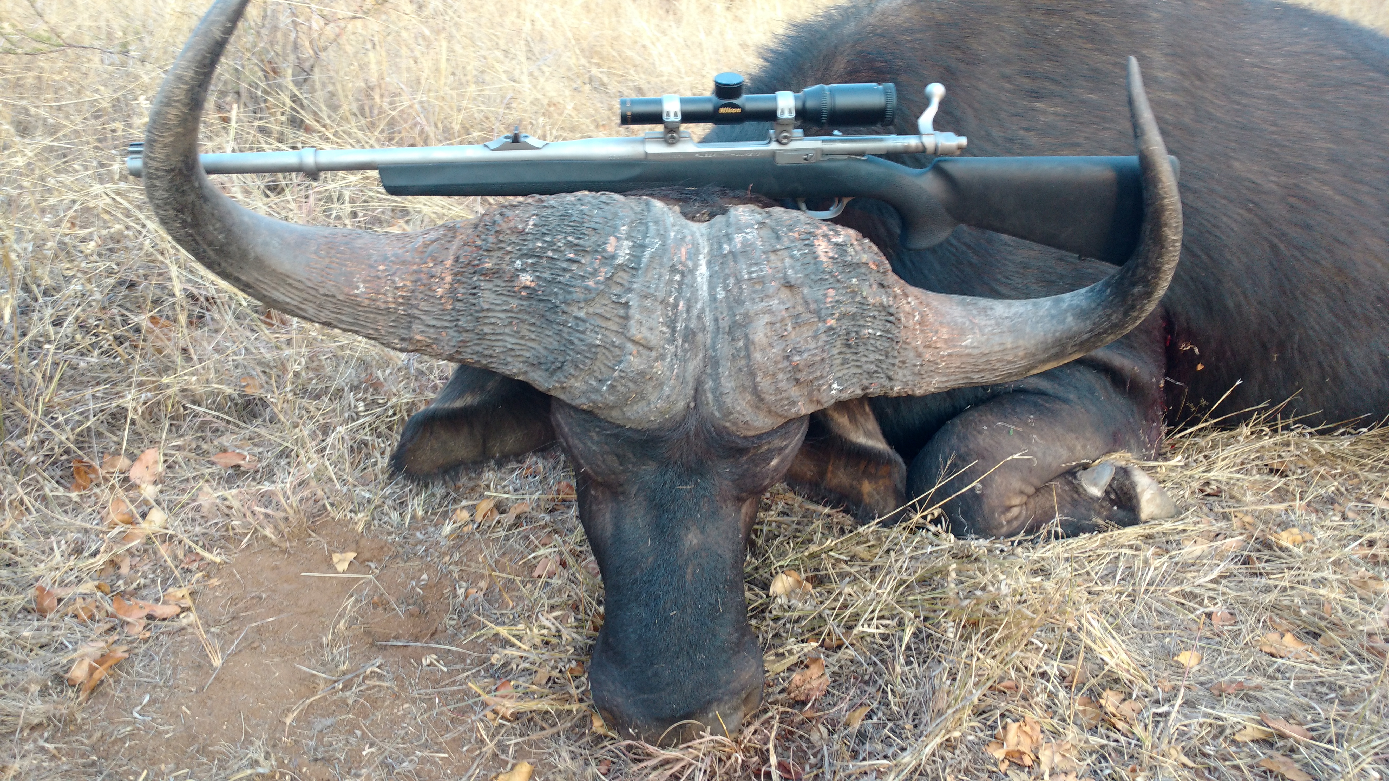 We go pick up my dad and then we head to the other side other hill and we are going to work that ridge to make sure they weren’t just bedded up there and laughing at us as we walk by. The walk, though beautiful, didn’t provide any results, it was like they had disappeared. But we were back to the truck and riding around seeing if we can make something happen. The wind was picking up quick a bit. But we were hopeful we would get lucky, I think my dad did another stalk on a wildebeest but I can’t entire remember. Rouan and I decided to take a stalk in the general area that we had seen the Sables and see if we can make something happen. We go into the trail on the other side, to cover one potential escape path and a frequent hang out area, basically walking along the side of the mountain covering a hidden field, and then cross it where we lost the Sable. We then go over the parallel hill and sneak around, we finally decide to just sit down by a waterhole they sometimes come to. It was hot and it was mid day, made sense to me. The makeshift blind had fallen apart but we just sat in the shadows under a tree. The wind was so bad it was perfect, it was blowing towards the waterhole but we were about 150 yards away and you could see it swirling, meaning our wind was so bad it was perfect!