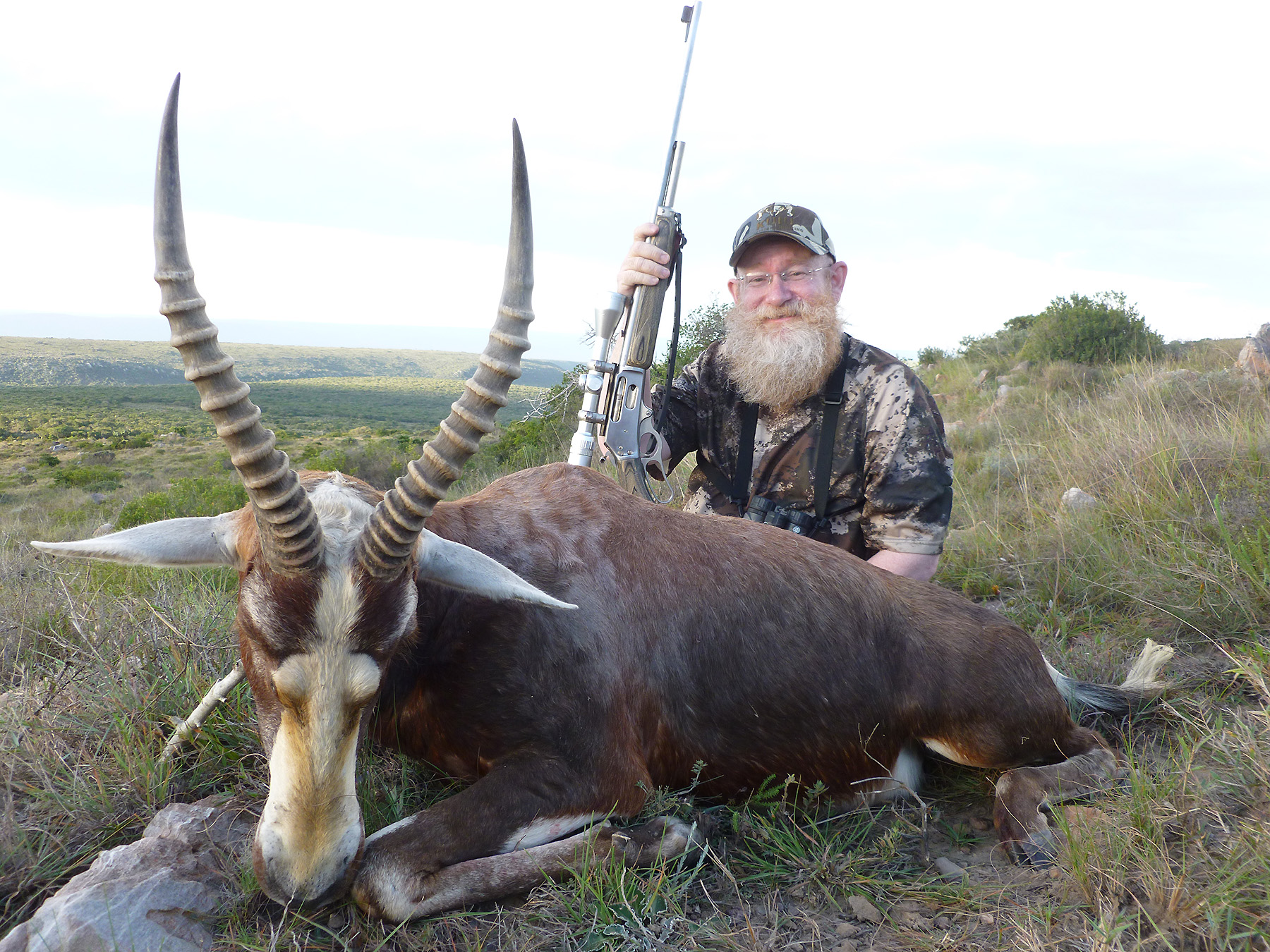 We went back to grass covered area with intermittent vegetation, where we’d seen a crap-ton of blesbok earlier in the day. We began a downhill stalk, with most blesbok running away as we did. Eventually we found a single bull that hung around a bit too long. From a seated position and the shorter tripod, Wik gave me a range of 220 yards. I was still nervous from the miss on the wildebeest and – wait for it – managed to do the exact same thing. I missed the first shot, hit him in the chest on the second, and then had to put a finishing shot in him from close range. Animal number two was down, though I was a still a bit rattled.