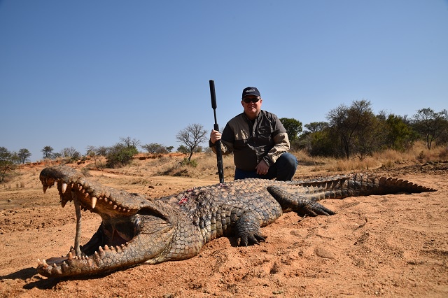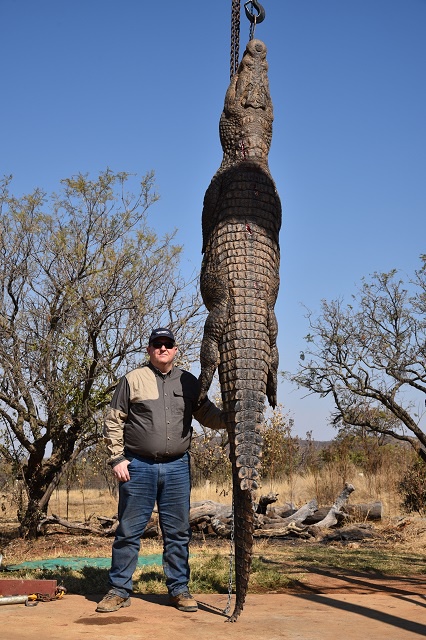 Some celebratory drinks, fantastic food, and off to some jet-lagged sleep for croc tomorrow. The mornings were chilly, around 40*F, so the crocs were coming out to sun themselves and warm up around 10-11am. So it was not an early start. I was up early with the time difference, so I sat outside and watched and listened to the world come to life while sipping some coffee. No light pollution, no city, no cars, no noise, just birds and lion roars is a fantastic way to start the day! Some breakfast, and it's off to check the banks of the lakes for a warming croc. After checking a couple we found a big lizard out sunning, got the wind and stalked in. We were able to stay below the lake wall due to the topography, so we got pretty close, I think 70 yards or so. Stefan and Larry crawled up, got prone on a pack, and steadied for the shot. This time I was prepared and had my camcorder, hovering just high enough to see the croc. Larry made a great shot right behind the smile with the .308, couple follow ups for insurance, and had his ~12' croc! They were able to get a truck/trailer to him, winch him up and take him to the skinning shed.