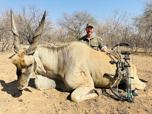 Tuesday the 23rd: Spent a lot of time driving around trying to find a good eland to stalk. No luck so we eventually decided to sit a blind for a bit to see what comes in. As we were about to leave some wildebeest started making their way in. That lead to a herd of eland as well. Then a second herd of eland from behind us. There was one shooter bull in the group. With so many animals and all the moving around getting a shot is tricky. I drew 3 times on this bull. With the first two draw/let down some of them caught movement and got nervous. A few of the bulls started to leave, and the big one was with them. This proved to be lucky since they walked to my side of the blind where I had a great shooting window. Third time is the charm, so this time as he was walking broadside, we stopped him with some grunts and i zipped my arrow through his shoulders at 35y, and we watched him fall not 40 yards from where he stood! Holy cow these things are huge! We got him winched into the land cruiser and to the skinning shed.