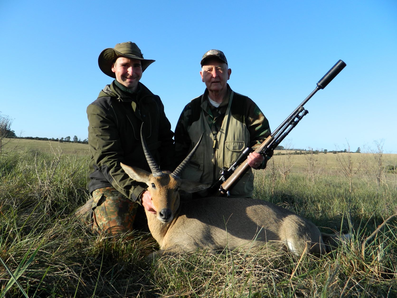 We stopped the jeep on a corner of the big field and we started to walk on our right. The wind picked up significantly. In this field the grass was a little lower compared to the previous field. During the walk we moved four reedbucks, but they were 3 females and a young male. We were on the way back to the pick-up, bordering the side of the field that we would have traveled if we had gone straight to the beginning, when suddenly the tracker, who was on the back of the line, whistled to us when we were at almost 60-70 meters from the jeep. He pointed something in front of us slightly on our left. We walked back to him and we followed the direction of his finger. There were two common reedbuck males lying down. We could see their heads and horns. If it weren’t for the tracker we would have passed them by making them run away. We were also lucky for two reasons: first for the beginning direction we undertook and second for the strong and good wind which drowned out the sound of our footsteps on the vegetation of the field. We were just 20-30 meters from the two common reedbucks. The one on the right was without doubts not mature, instead the other male looked like a right one to be shot judjing the lenght and the curl frontward of the horns. My dad was ready for a neck shot being so close. But the problem was that he was facing in the opposite direction of us and the PH had to confirm 100% that common reedbuck was mature observing him frontal or broadside: like the male facing right, if the male presents white horn segments from the bases it means the horns are still growing instead if they are black is mature. We had no other choice to move inside the field in order to see the horns broadside. From that position we had higher grass, so my dad with the PH arrived just 5-10 meters from them. At this point they sensed the human presence so close and ran away. Now the PH with the binocular saw it was a nice mature male. The two common reedbuck disappeared from our sight over a little hill. The PH told us to wait some minutes in order to calm them down. We saw them in a other field standing up. They were at almost 250 meters. My dad lay down and shot. The bullet passed over his back. The common reedbuck remained still for some seconds and then he moved on the right returning towards the previous field where there was also a woodland on the opposite side. Slowly we made a wide turn taking advantage of the strong wind and we met again that mature common reedbuck. It was at 130 meters and from the stick my dad shot again. This time I could see perfectly that the male was hit: he bowed his head down hunched over and after few seconds he fall straight down. The shot was perfect on the shoulder. My dad knew that this was the hardest animal to harvest in this safari considering his absolutely elusive nature and he was extremely happy for the very beautiful trophy and for the heart-pounding hunting action. If the common reedbuck is obtained in a safari, most of the time is during the night using flash light. Not many hunters can say that they have experienced a stalking hunt like this on a common reedbuck, also the PH was very excited after this incredible hunt.