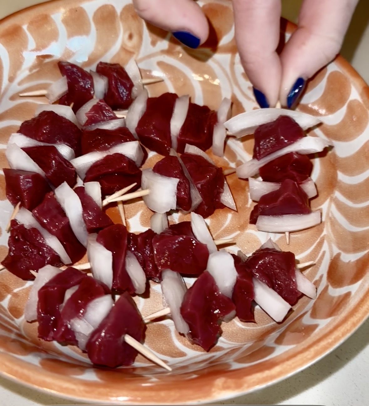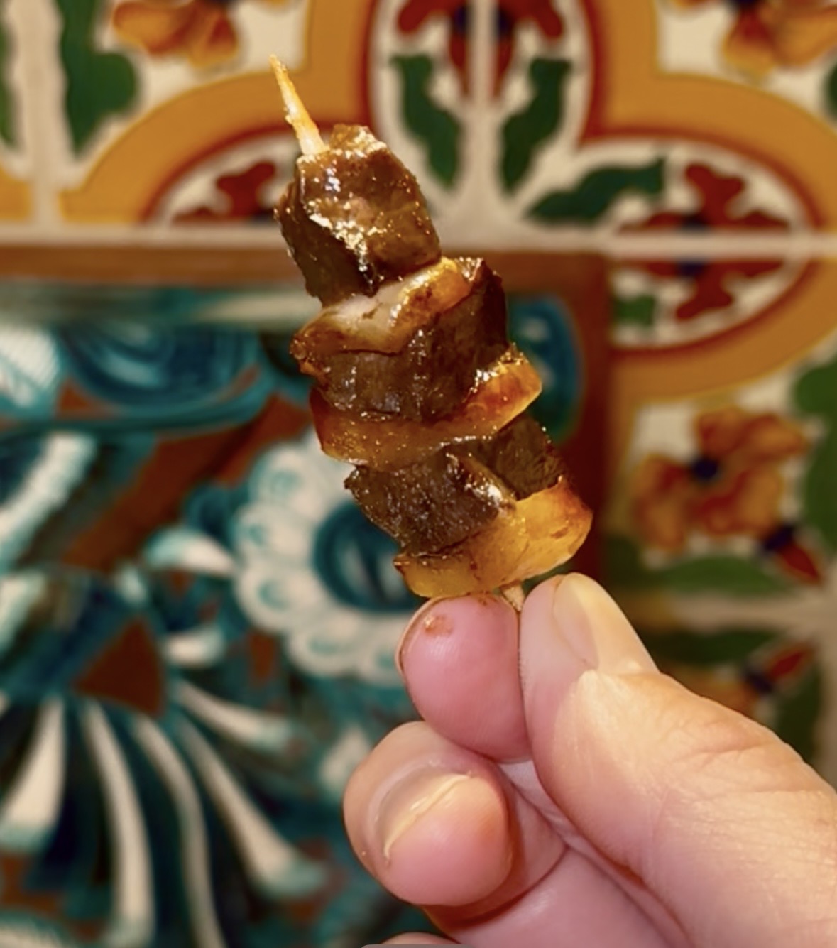 The heart was then cubed very small and stacked onto toothpicks with bits of white onion, forming little kabob-style bites. These were soaked in a Japanese spicy BBQ glaze for about six hours.