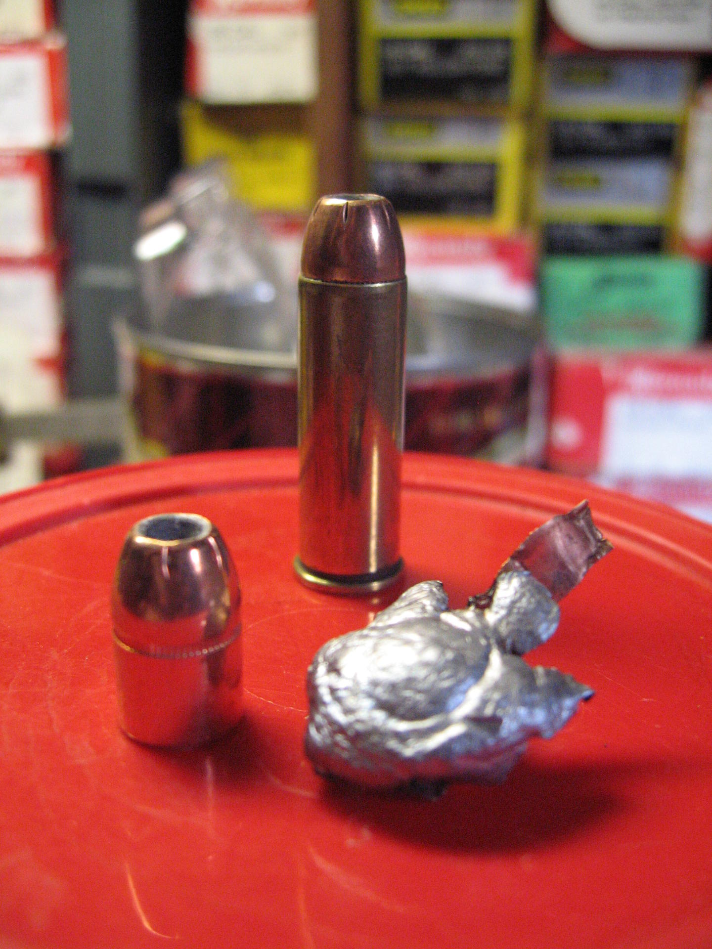 through which I fired some handloads worked up by American gun writer John Taffin and listed in the Freedom Arms Collector Assoc. journal. These handloads pushed a 210gr XTP at 1700+fps with excellent accuracy.The XTP is a great bullet but with the introduction , by Swift, of a 210gr A-frame, partition type bullet puts the 41 into a higher catagory of game taking or at least a higher sense of confidence in the caliber and weight.One of the attached pictures shows a recovered 210gr XTP from a close range shot on a large boar that held together despite the high MV and size of the animal taken.There is another photo (showing a single expanded bullet) of a 210gr Swift A-frame that was also shot into a large boar with the same handload from the same gun. Both bullets worked, however, the Swift shows picture perfect expansion plus the fact that , because of the partition, the bullet will continue without any more weight loss.The bottom line is that since I`ve reached 61 its nice to have a accurate gun that will take medium game out to 125yds without having the blast and kick of a 454 or even a 44....
