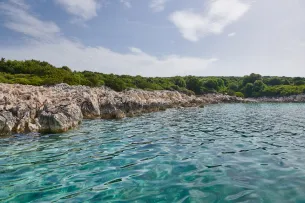 Arriving in Zagreb, Ana and Marijan were already waiting for me at the airport, and after a warm welcome, we started our journey towards the Adriatic Sea. The next morning, we were to set off. Ana and Marijan had borrowed a small motorboat that was ready in the harbor. We quickly loaded a rifle and some provisions for a picnic, and off we went. Off the coast are some islands that are uninhabited. From the mainland, you can only get there by motorboat. You can easily land there at several small bays – at all other places, the island shore is too rocky. Last year, Marijan leased the hunting rights for one of these islands for ten years and hunts wild boar, fallow deer, and feral sheep there. It is not known exactly how the deer got to the islands, but the sheep were released there long ago for meat and cheese production. Marijan first drives around the island, which at first glance presents itself with a friendly, green face, and then heads for a small bay.