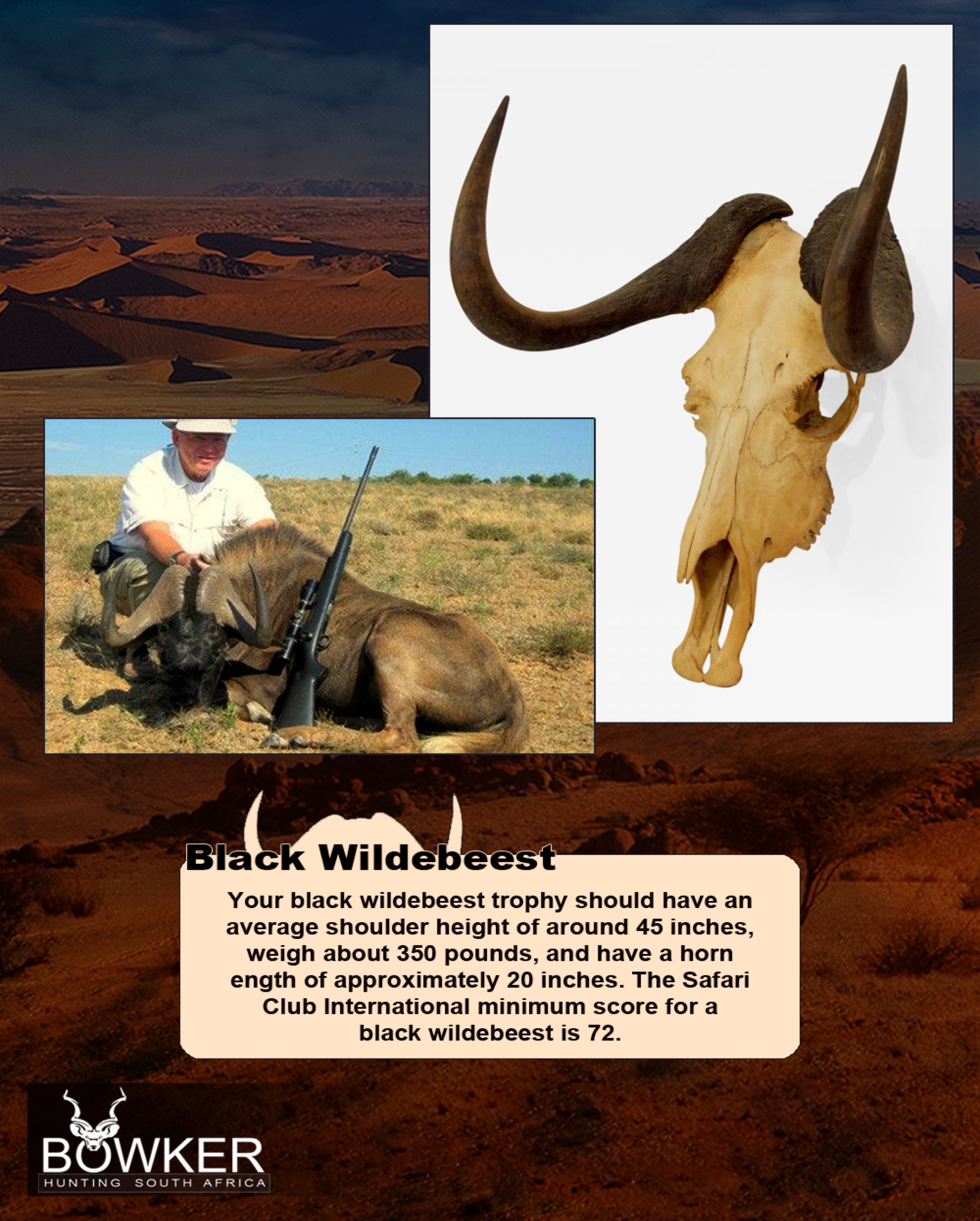 Both genders have well-developed horns that have their origins in a thickened boss on thehead and then extend forwards in a deep, downwards curve. As with the rhino, red hartebeest and warthog, the best trophy is not necessarily found on the oldest bull, but is rather found earlier when the bull is in its prime. This is due to the constant weathering of the horn during adulthood. Generally black wildebeest reach their maximum trophy status at an age of about 3.5 years.