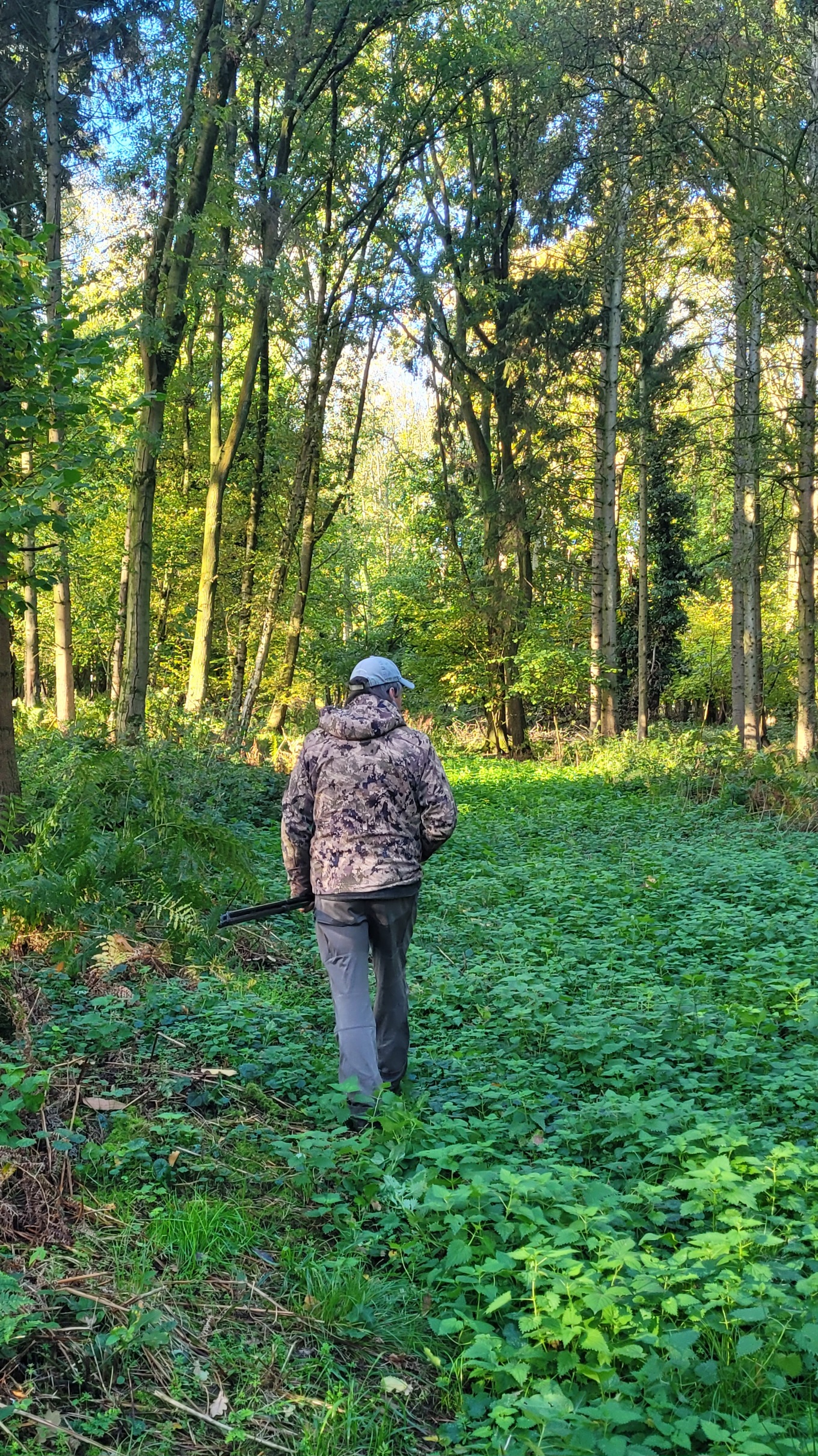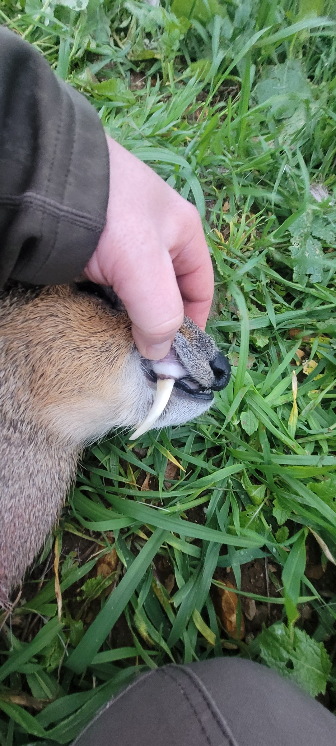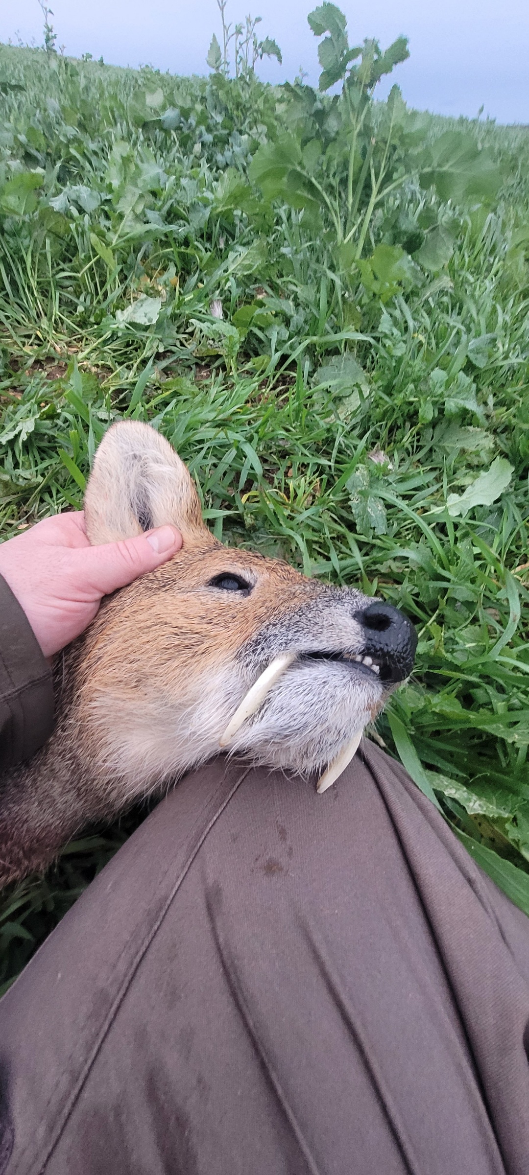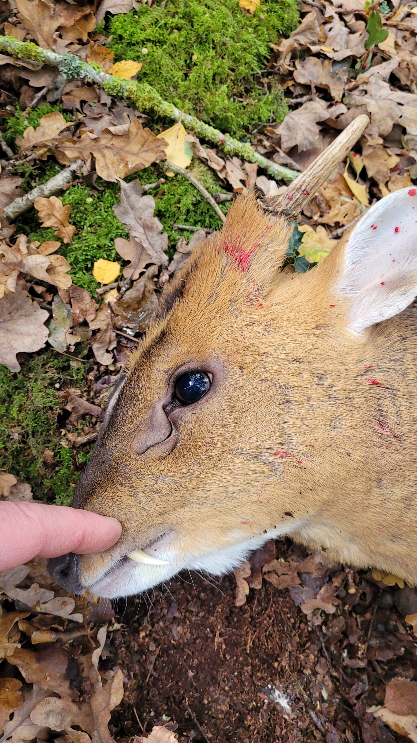 On the afternoon of day 1, after stalking several woodland areas and passing up a few younger animals, I got my Muntjac after a calling session in a small clearing. He came in behind us of course, so I had to ditch the sticks and shoot over a fallen tree trunk. James' Mauser M03 243 with Z6i Swarovski was spot on. Somehow the buck made it 50 metres into the undergrowth with a smashed heart and lungs, but after a few stressful moments we found him stone dead. A very cool and unique little deer, with his large glands, small antlers and fangs.